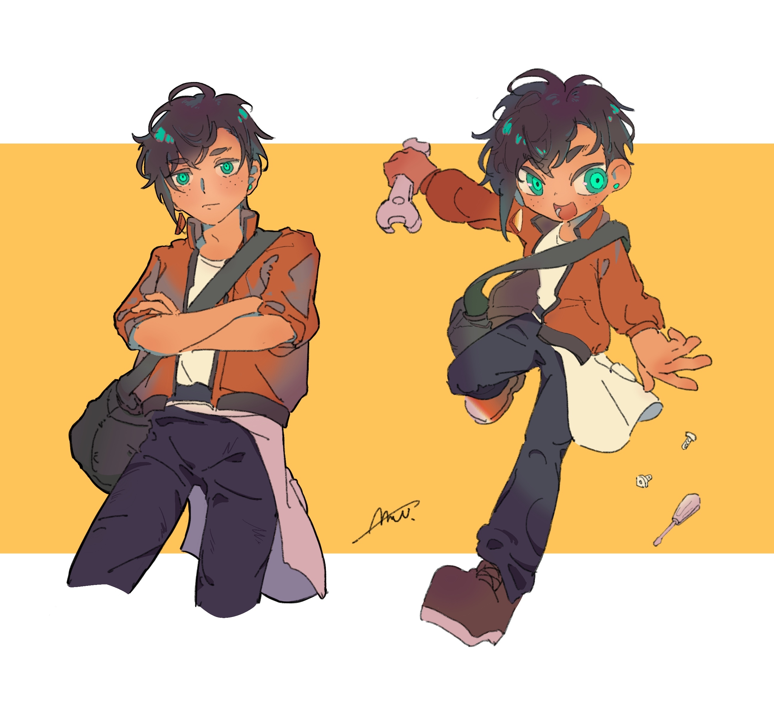 1boy belt black_bag black_belt black_hair black_pants brown_shoes chinese_commentary commentary_request cropped_legs crossed_arms earrings freckles green_eyes highres holding holding_wrench jacket jewelry long_sleeves male_focus mo_wen multiple_views open_clothes open_jacket orange_jacket original pants screw screwdriver shirt shoes short_hair signature sleeves_rolled_up stud_earrings tan white_shirt wrench