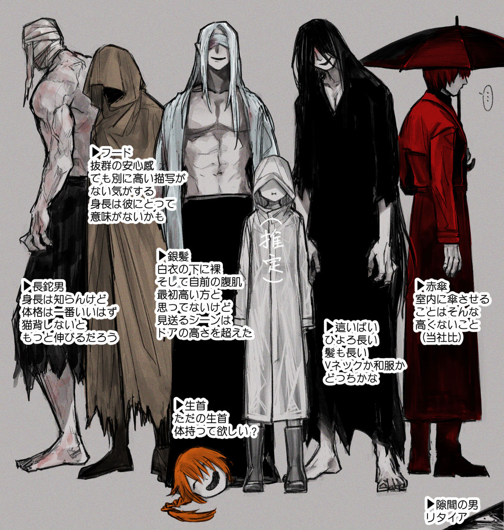 1girl 6+boys bandaged_head bandages bandages_over_eyes bayonet_(flt906) black_hair black_kimono blood blood_on_clothes brown_cloak cloak coat commentary_request grey_background hands_in_pockets adashino_adami holding holding_umbrella homicipher japanese_clothes kimono long_hair mr._chopped mr._crawling mr._hood mr._machete mr._scarletella mr._silvair multiple_boys open_clothes open_coat pointy_ears raincoat red_coat red_hair red_umbrella severed_head short_hair simple_background skirt standing toned toned_male topless_male translation_request umbrella very_long_hair white_hair