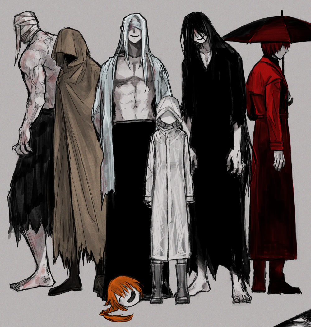 1girl 6+boys bandaged_head bandages bandages_over_eyes bayonet_(flt906) black_hair black_kimono blood blood_on_clothes brown_cloak cloak coat commentary_request grey_background hands_in_pockets adashino_adami holding holding_umbrella homicipher japanese_clothes kimono long_hair mr._chopped mr._crawling mr._hood mr._machete mr._scarletella mr._silvair multiple_boys open_clothes open_coat pointy_ears raincoat red_coat red_hair red_umbrella severed_head short_hair simple_background skirt standing toned toned_male topless_male umbrella very_long_hair white_hair
