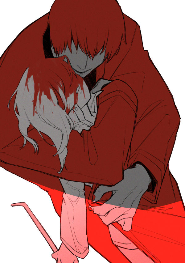 1boy 1girl bayonet_(flt906) coat commentary_request cowboy_shot crowbar adashino_adami hetero holding holding_crowbar homicipher hug hug_from_behind long_hair mr._scarletella raincoat red_coat red_hair red_theme short_hair simple_background white_background