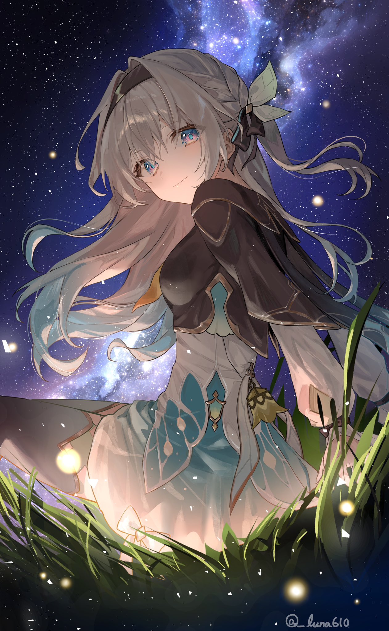 1girl artist_name black_hairband blue_eyes blue_hair braid commentary dutch_angle fireflies firefly_(honkai:_star_rail) gradient_hair grass grey_hair hairband highres honkai:_star_rail honkai_(series) long_hair looking_at_viewer looking_down luna_(luna610) multicolored_eyes multicolored_hair sitting smile solo two-tone_eyes