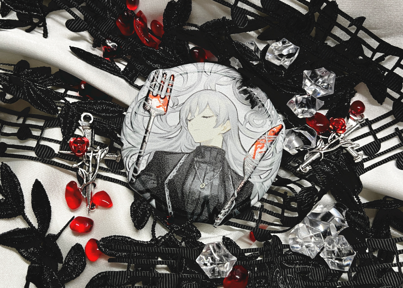 1girl angelica_(project_moon) badge black_jacket black_sweater blood button_badge closed_eyes closed_mouth commentary fork gem gloves hair_spread_out jacket jewelry knife lapels library_of_ruina long_hair long_sleeves necklace nishikujic photo_(medium) project_moon red_gloves ring ring_necklace silver_trim sweater untranslatable_commentary very_long_hair white_gem white_hair