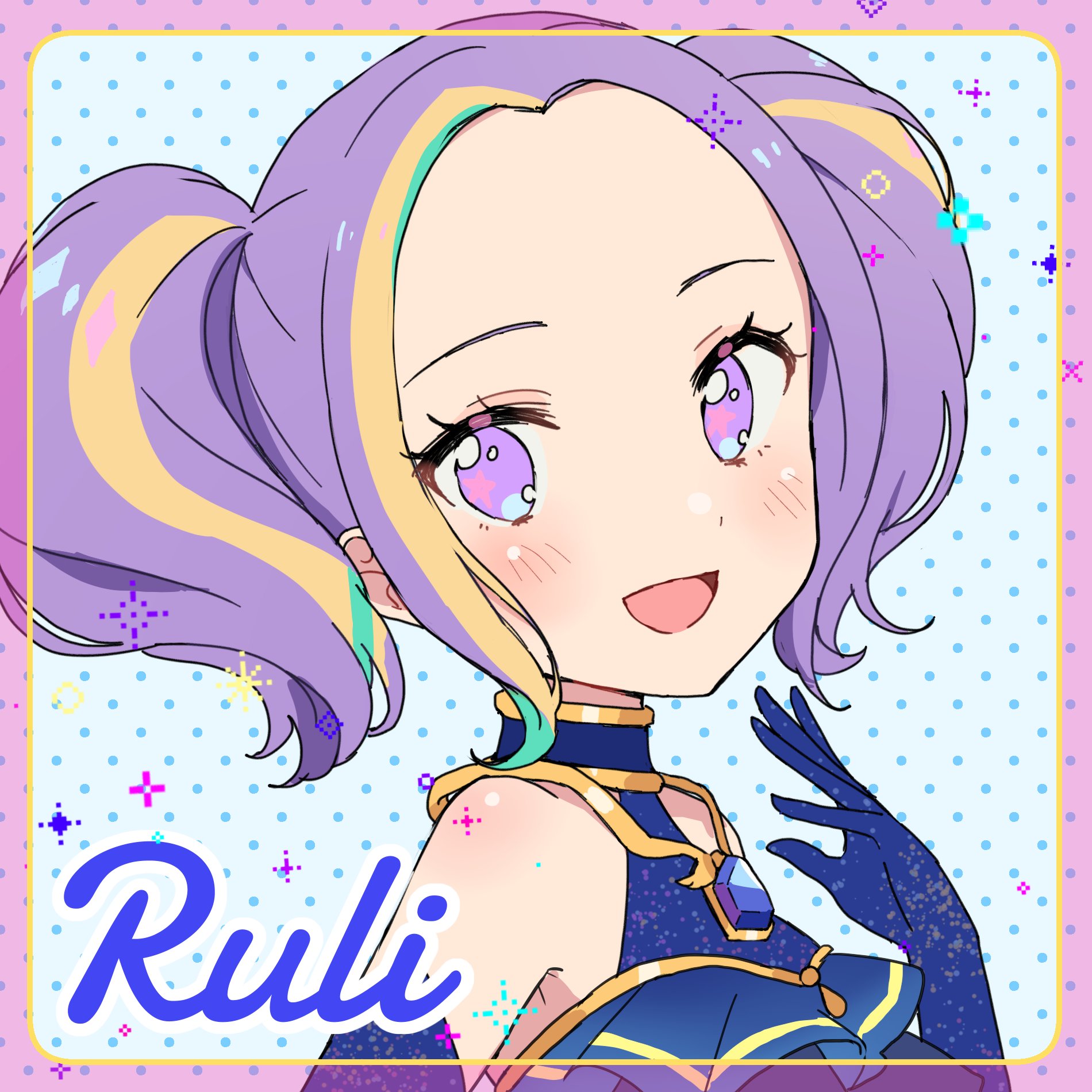 1girl :d aikatsu!_(series) aikatsu_planet! bad_id bad_twitter_id bare_shoulders blue_gloves blush border character_name commentary gloves hand_up highres idol_clothes long_hair looking_at_viewer multicolored_hair ogura_(onigiritakusan) open_mouth polka_dot polka_dot_background purple_eyes purple_hair ruli_(aikatsu_planet!) smile solo sparkle streaked_hair untranslatable_commentary twintails upper_body