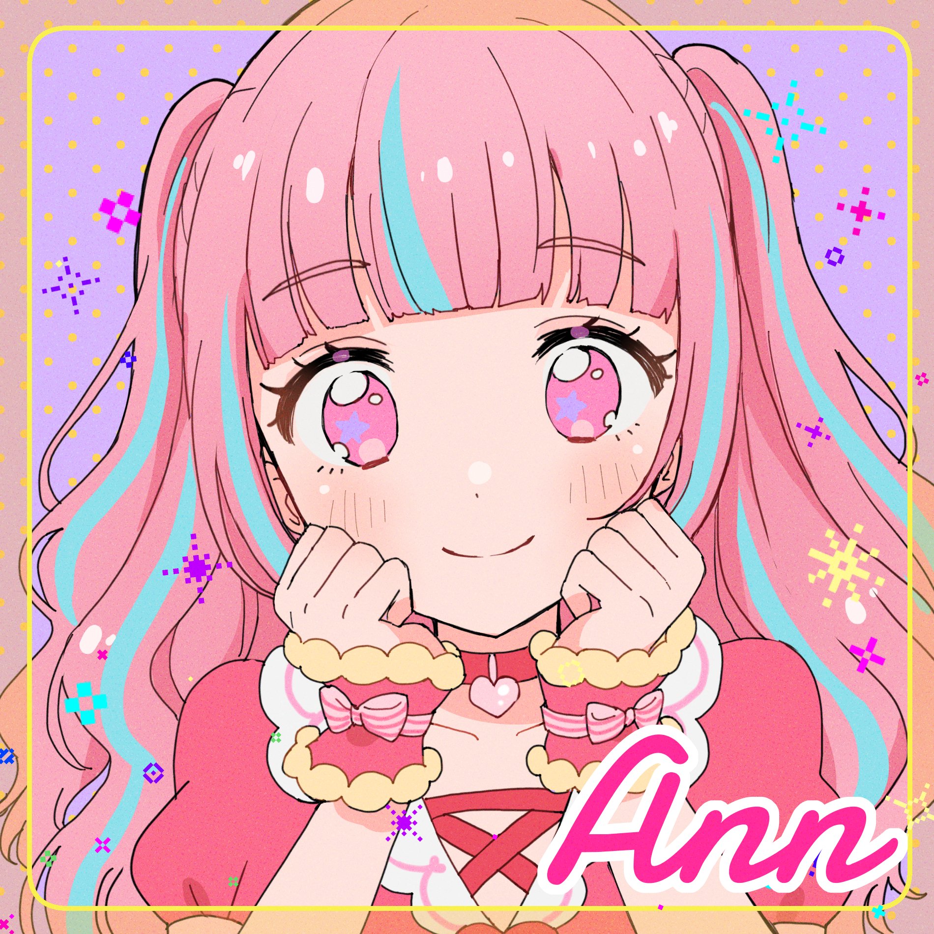 1girl aikatsu!_(series) aikatsu_planet! ann_(aikatsu_planet!) blue_hair blunt_bangs border character_name choker closed_mouth commentary hands_up heart heart_choker highres long_hair looking_at_viewer multicolored_hair ogura_(onigiritakusan) pink_eyes pink_hair puffy_short_sleeves puffy_sleeves purple_background short_sleeves smile solo sparkle streaked_hair untranslatable_commentary two-tone_hair two_side_up upper_body