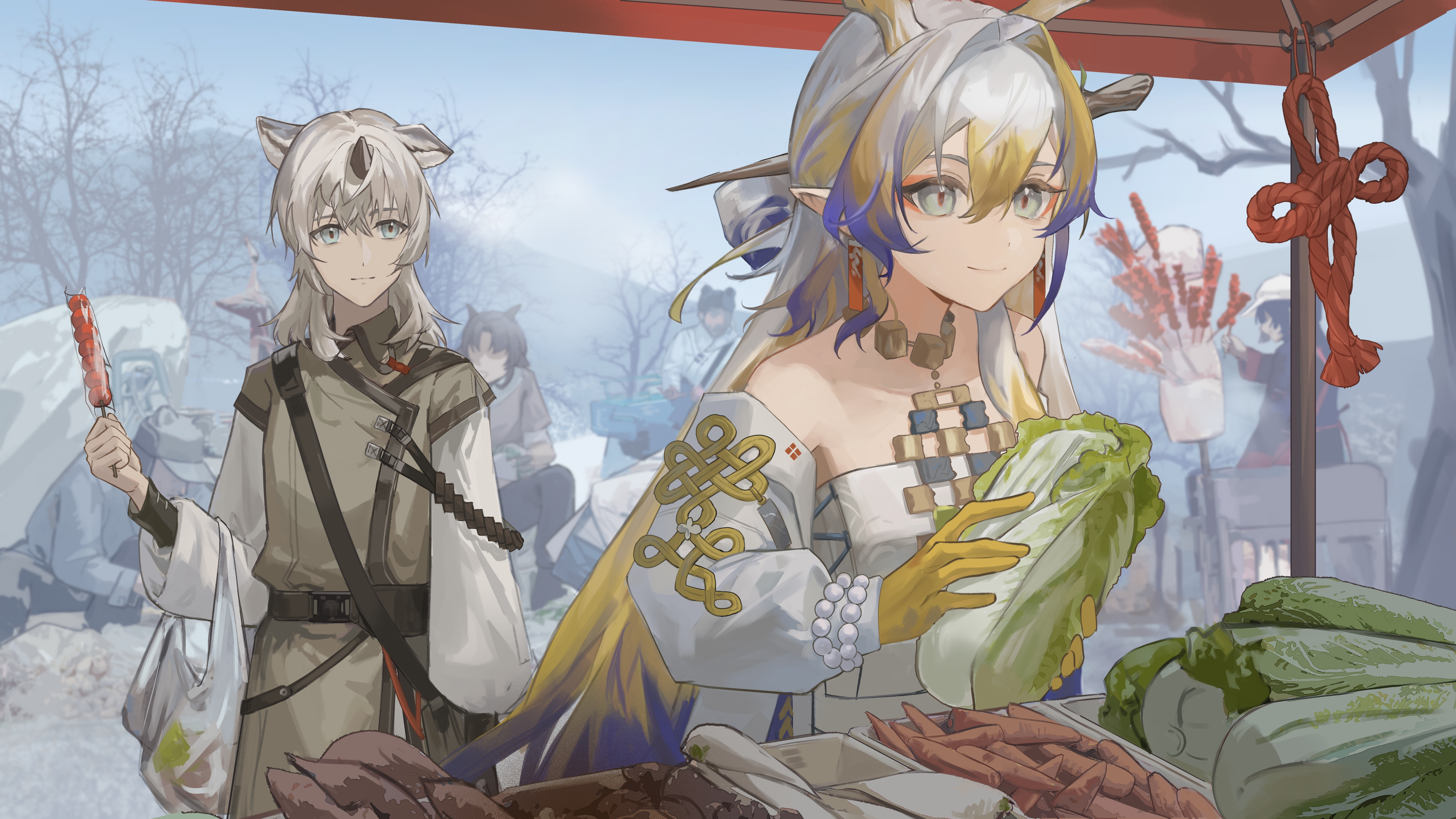 1girl 5boys absurdres animal_ears arknights bare_shoulders beads blonde_hair carrot character_request chinese_commentary closed_mouth collared_shirt colored_extremities commentary_request day dragon_girl dragon_horns earrings eyeliner food green_eyes grey_hair grey_shirt hair_between_eyes hair_intakes highres holding holding_food horns jacket jewelry layered_sleeves lettuce long_sleeves looking_at_another makeup medium_hair multiple_boys necklace off_shoulder orange_eyeliner outdoors plant pointy_ears purple_hair rope shirt short_over_long_sleeves short_sleeves shu_(arknights) smile tent tree white_jacket white_shirt wudianduo068