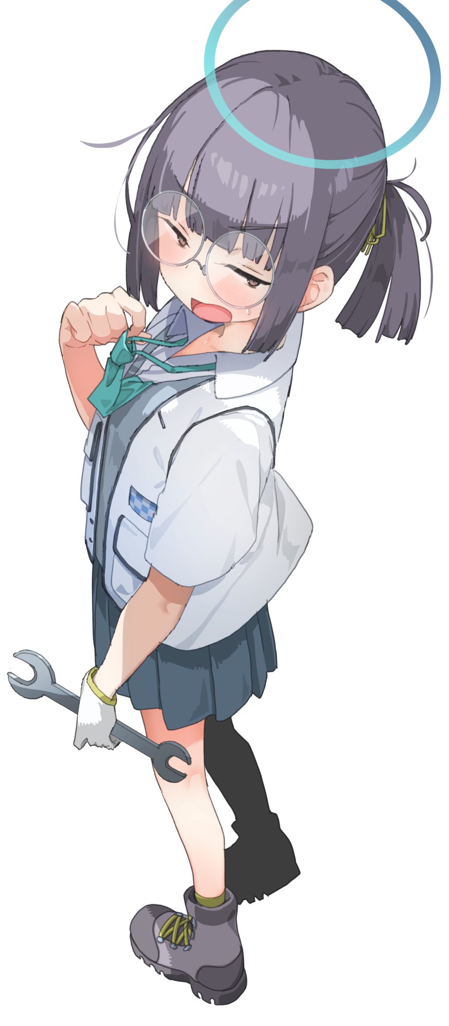 1girl black_hair blue_archive blunt_bangs boots brown_eyes from_above glasses halo highres hoshi_umi low_ponytail millennium_science_school_student_(blue_archive) millennium_science_school_student_a_(blue_archive) pleated_skirt ponytail round_eyewear school_uniform sidelocks simple_background skirt sweater_vest white_background wrench