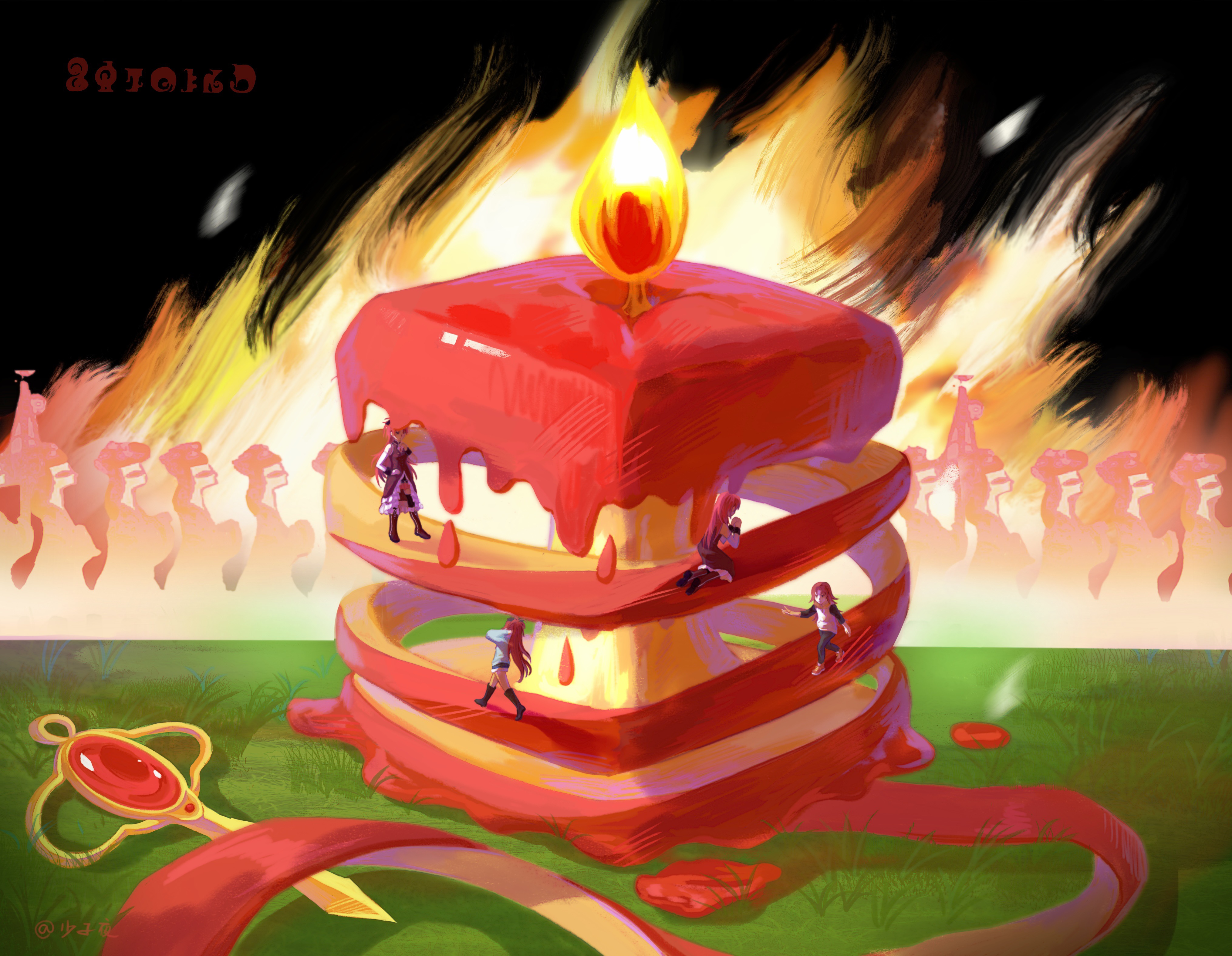 4girls absurdres age_progression aged_down apple apple_core artist_name burning candle dripping fire food fruit gem highres kneeling madoka_runes mahou_shoujo_madoka_magica mahou_shoujo_madoka_magica_(anime) multiple_girls multiple_persona red_gem red_hair sakura_kyoko sakura_kyoko_(magical_girl) shao_ziye time_paradox walking wide_shot