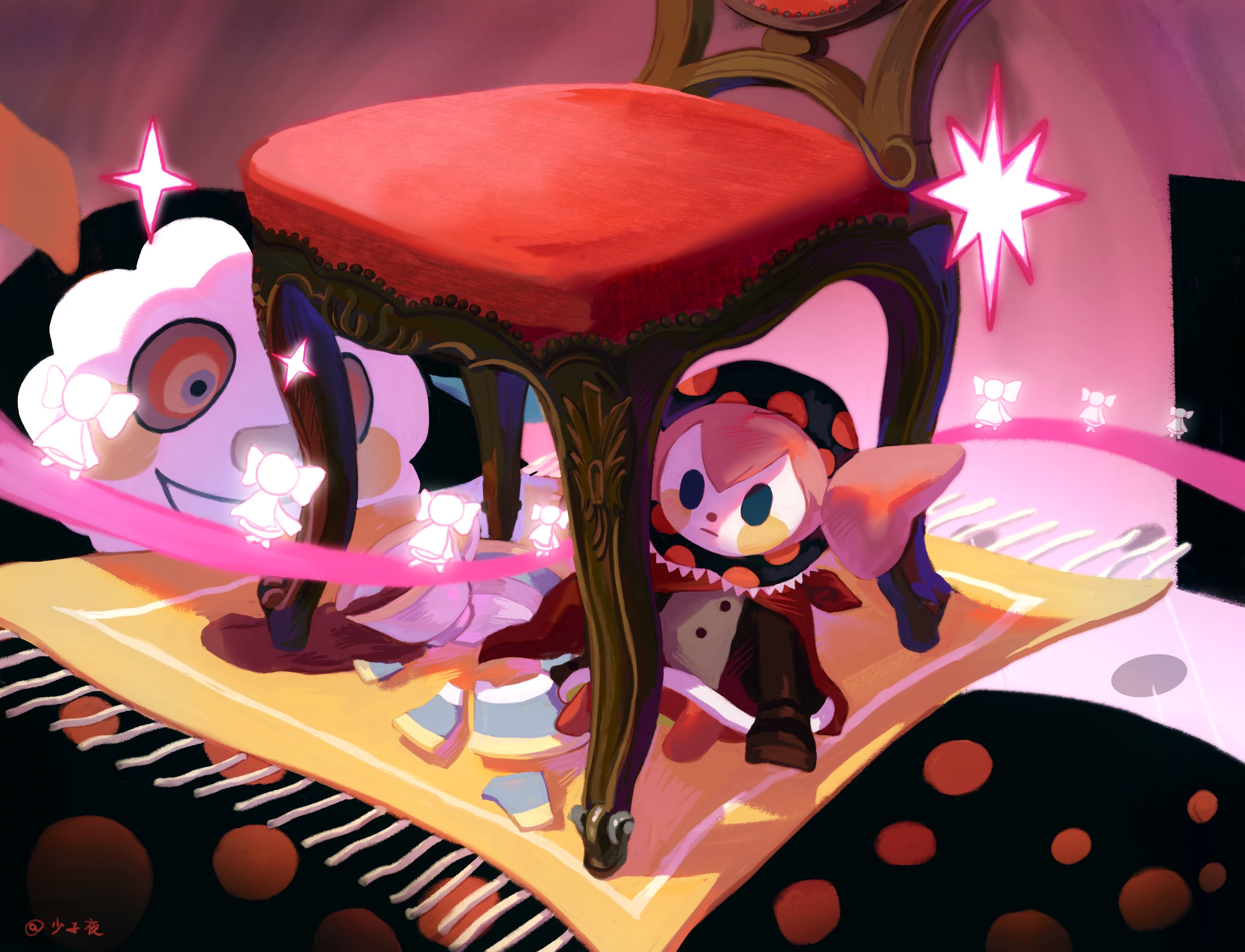 1girl absurdres artist_name blush_stickers chair charlotte_(madoka_magica) highres mahou_shoujo_madoka_magica mahou_shoujo_madoka_magica_(anime) pink_hair pink_ribbon ribbon rug shao_ziye solid_oval_eyes sparkle surreal witch_(madoka_magica)