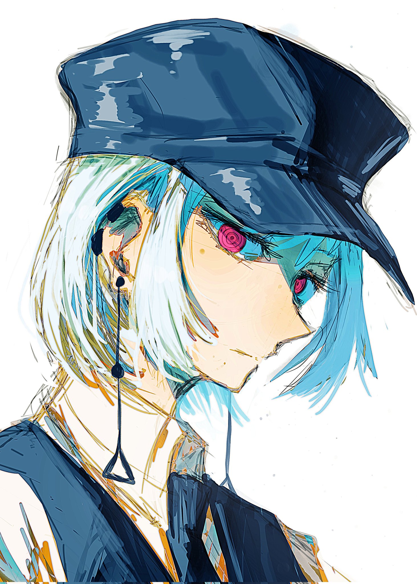 1girl baku_mbu blue_dress blue_hat chainsaw_man closed_mouth collared_shirt dress earrings fami_(chainsaw_man) fourth_east_high_school_uniform grey_hair hat highres jewelry neck_ribbon peaked_cap pink_eyes ribbon ringed_eyes school_uniform shirt simple_background solo white_background white_shirt