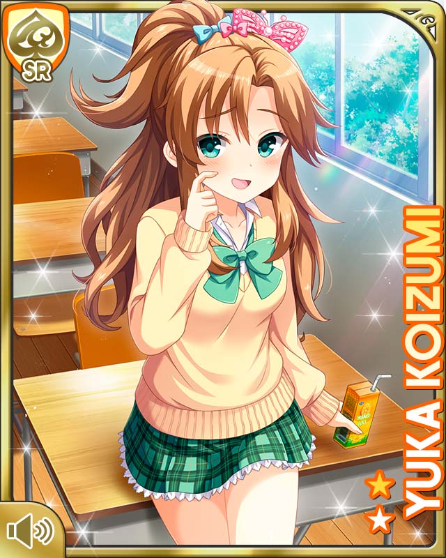 1girl blue_bow bow brown_hair butterfly_hair_ornament card character_name classroom desk drink_carton girlfriend_(kari) green_bow green_eyes green_skirt hair_ornament hairclip juice_box koizumi_yuka_(gf_kari) laughing official_art open_mouth pink_bow plaid_clothes plaid_skirt ponytail qp:flapper school school_desk school_uniform shirt sitting sitting_on_object skirt solo tagme white_shirt window