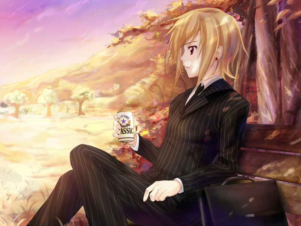 1girl androgynous artist_request beer_can bench black_necktie black_suit blonde_hair briefcase can cloud drink drink_can earrings formal_clothes game_cg grass holding holding_can holding_drink jewelry katawa_shoujo necktie non-web_source official_art on_bench open_mouth outdoors red_eyes reverse_trap satou_akira short_hair sitting sky solo suit tree wooden_bench