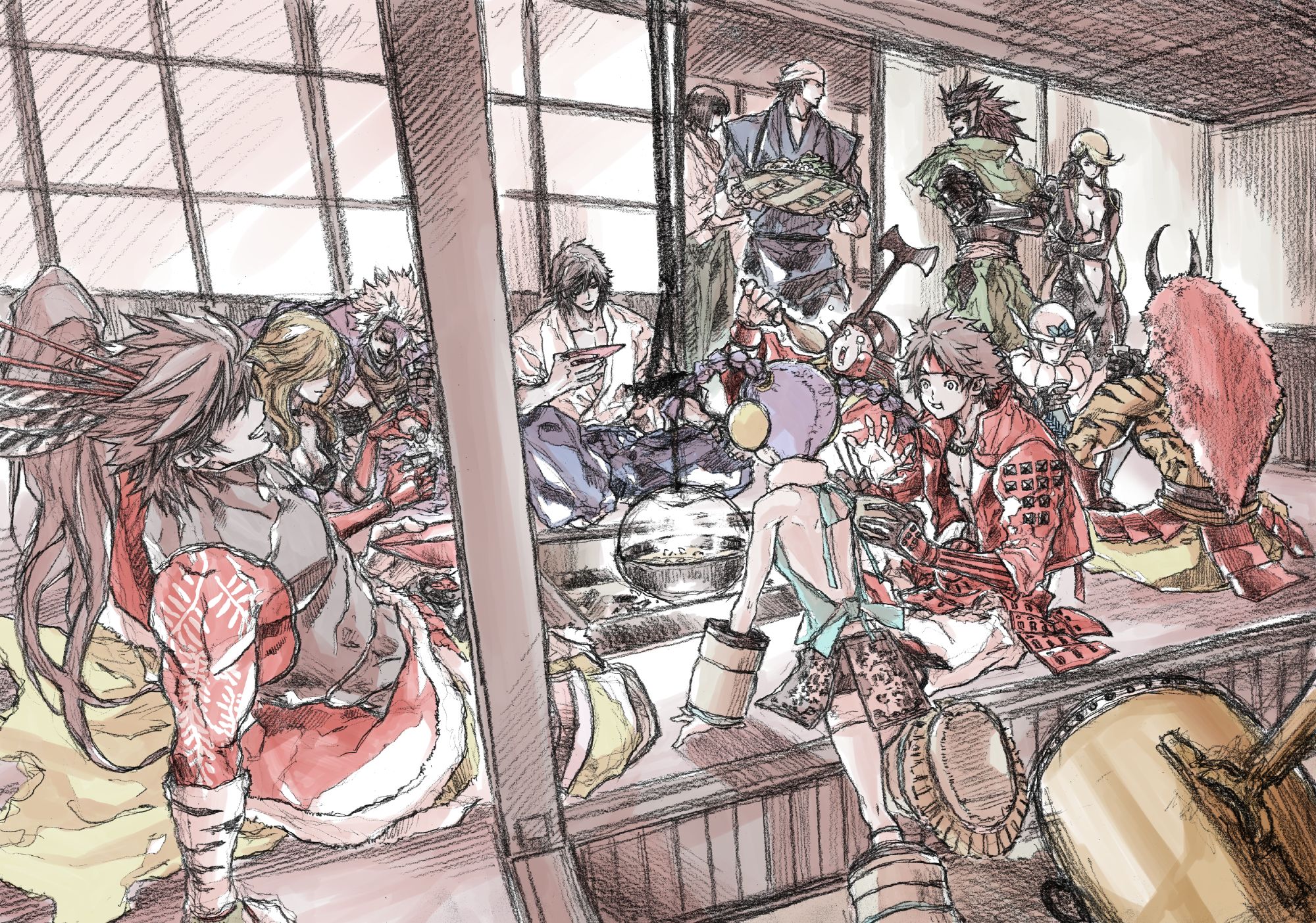 1other 3girls 6+boys :d ^_^ armor bandana basket black_hair blonde_hair braid brown_hair chousokabe_motochika_(sengoku_basara) closed_eyes cropped_jacket cup date_masamune_(sengoku_basara) earmuffs fake_horns grin hakama hakama_pants headband helmet highres holding holding_basket holding_cup holding_spoon horns itsuki_(sengoku_basara) jacket japanese_armor japanese_clothes kabuto_(helmet) kasuga_(sengoku_basara) katakura_kojuurou_(sengoku_basara) kobayakawa_hideaki_(sengoku_basara) long_hair maeda_keiji_(sengoku_basara) male_focus medium_hair multiple_boys multiple_girls o_o open_mouth pants ponytail porch purple_hair red_headband red_jacket saika_magoichi_(sengoku_basara) sakazuki sarutobi_sasuke_(sengoku_basara) sengoku_basara shibata_katsuie_(sengoku_basara) short_hair sleeveless smile spiked_hair spoon takeda_shingen_(sengoku_basara) twin_braids uesugi_kenshin_(sengoku_basara) white_bandana white_hair yoshihara_motoki