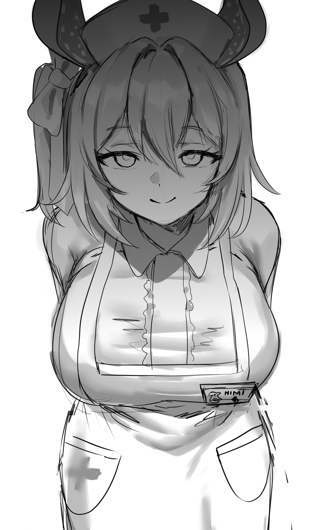 1girl animal_ears apron breasts dress hat highres huge_breasts indie_virtual_youtuber long_sleeves looking_at_viewer medium_hair nimi_nightmare nurse_cap one_side_up redi_(rasec_asdjh) simple_background sketch smile smug solo tapir_ears tapir_girl virtual_youtuber white_background