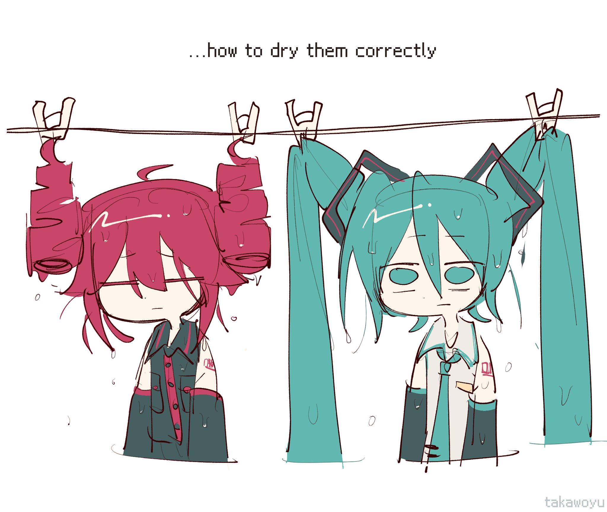 2girls :| aqua_eyes aqua_hair aqua_necktie artist_name black_sleeves blue_eyes blue_hair closed_eyes closed_mouth cropped_torso detached_sleeves drill_hair dripping drying english_text grey_shirt hair_between_eyes hanging hashtag-only_commentary hatsune_miku highres kasane_teto kasane_teto_(utau) long_hair multiple_girls necktie number_tattoo red_hair shirt simple_background takawoyu tattoo twin_drills twintails upper_body utau vocaloid water_drop wet wet_clothes wet_hair white_background