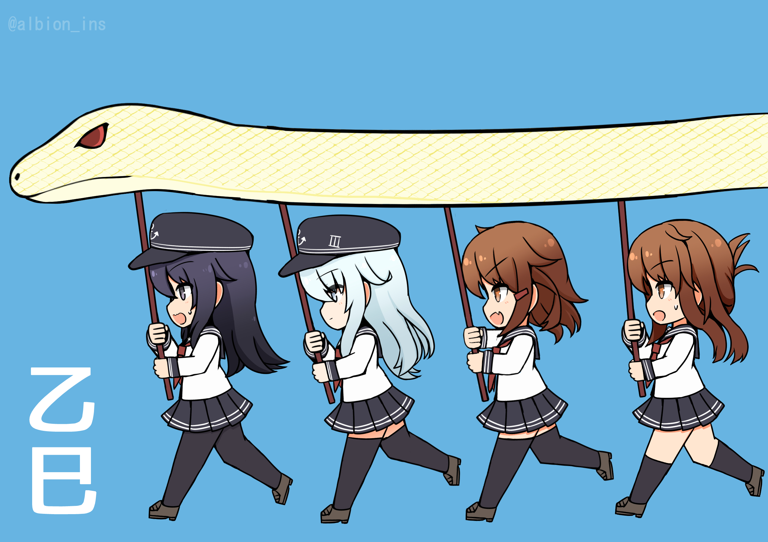 4girls akatsuki_(kancolle) albion_ins black_hair black_hat black_pantyhose black_sailor_collar black_skirt black_thighhighs blue_background blue_eyes brown_eyes brown_hair chinese_zodiac flat_cap folded_ponytail hat hibiki_(kancolle) highres ikazuchi_(kancolle) inazuma_(kancolle) kantai_collection long_hair multiple_girls pantyhose pleated_skirt sailor_collar school_uniform serafuku short_hair skirt snake thighhighs year_of_the_snake