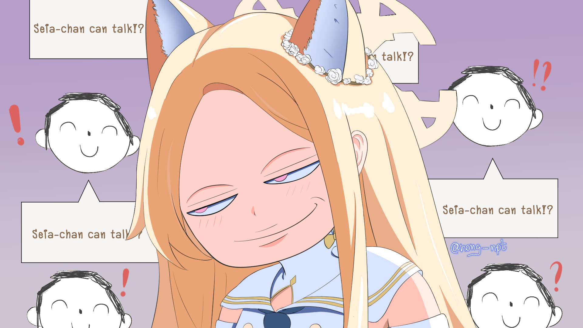 !? 1girl animal_ear_fluff animal_ears anya's_heh_face_(meme) backlighting bare_shoulders blonde_hair blue_archive close-up closed_mouth commentary doodle_sensei_(blue_archive) english_commentary english_text extra_ears flower_wreath forehead fox_ears halo highres jitome light_blush long_hair looking_to_the_side meme nong_npt parody parted_bangs pink_eyes playable_character_celebration purple_background sailor_collar seia_(blue_archive) sensei_(blue_archive) simple_background smile smirk solo speech_bubble spy_x_family straight_hair tanezaki_atsumi twitter_username voice_actor_connection white_sailor_collar yellow_halo