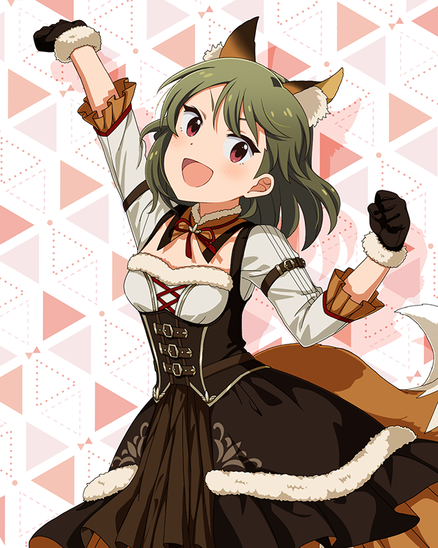 1girl :d animal_ear_fluff animal_ears arm_up blush bodice breasts brown_dress brown_gloves detached_collar dirndl dot_nose dress eyelashes fake_animal_ears fox_ears fox_tail frilled_sleeves frills fur-trimmed_collar fur-trimmed_gloves fur_trim german_clothes gloves green_hair hand_up idolmaster idolmaster_million_live! idolmaster_million_live!_theater_days konkon_comfort_(idolmaster) light_blush looking_at_viewer nagayoshi_subaru neck_ribbon official_alternate_costume official_art open_mouth parted_bangs red_eyes ribbon shirt short_hair sleeveless sleeveless_dress three-quarter_sleeves small_breasts smile solo tail triangle_background underbust v-shaped_eyebrows white_shirt