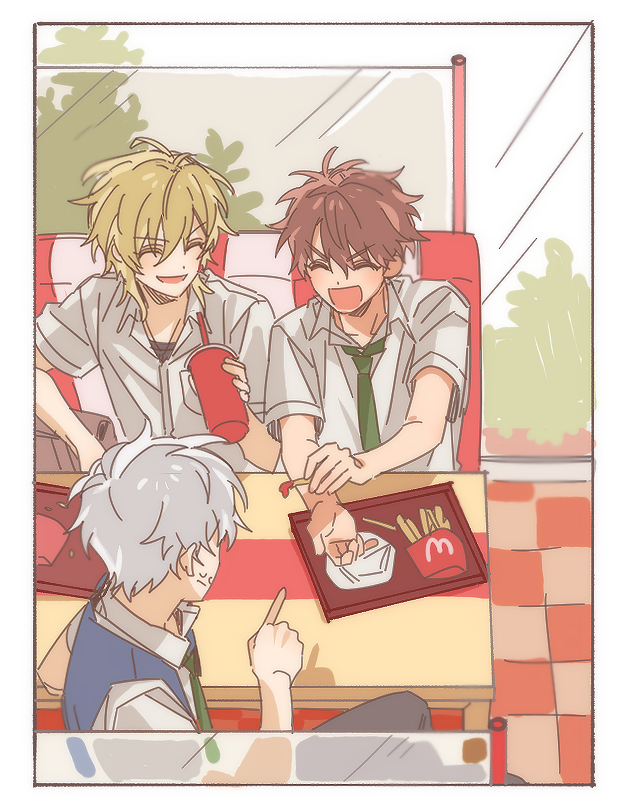 3boys arm_up blonde_hair booth_seating brown_hair bush closed_eyes cup ensemble_stars! food french_fries green_necktie grey_hair hakaze_kaoru holding holding_cup holding_food index_finger_raised looking_at_another medium_hair morisawa_chiaki multiple_boys necktie official_alternate_costume open_mouth outstretched_hand school_uniform sena_izumi_(ensemble_stars!) shirt short_hair short_sleeves sketch_background smile supern0va tile_floor tiles white_shirt window