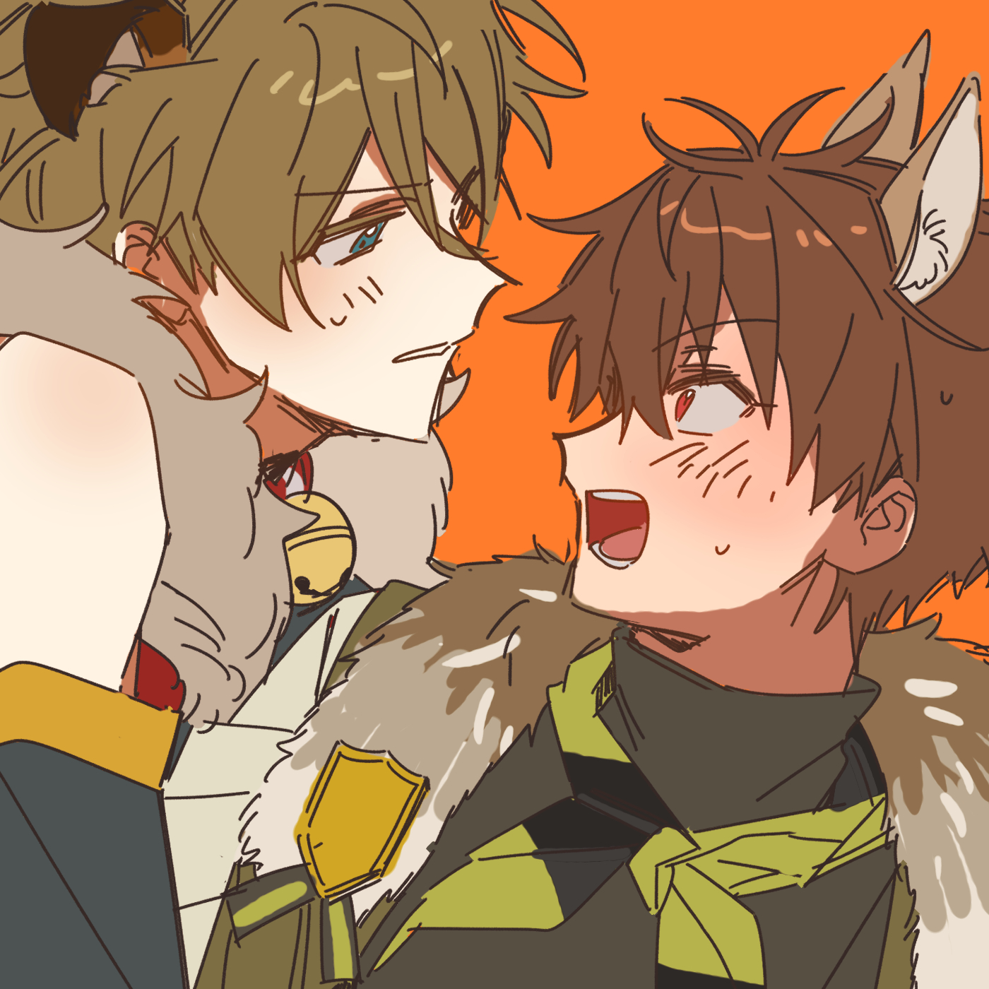 2boys alternate_costume animal_ears bell black_sleeves blue_eyes blush brooch brown_hair detached_sleeves ensemble_stars! fur_trim highres jewelry jingle_bell korean_commentary looking_at_another male_focus morisawa_chiaki multiple_boys open_mouth orange_background red_eyes supern0va surprised sweatdrop takamine_midori turtleneck