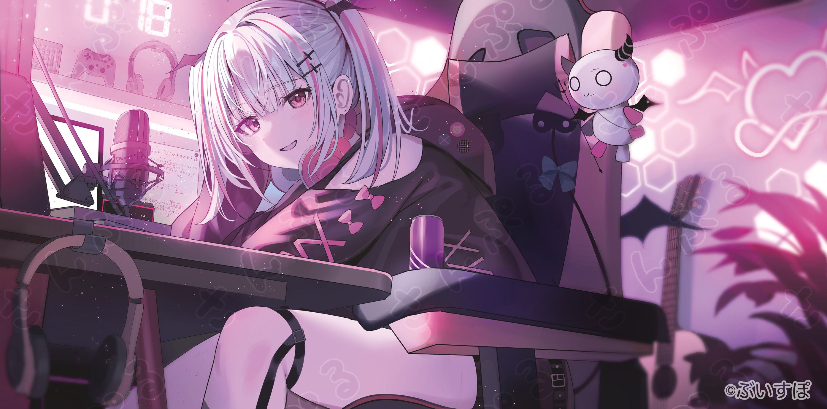 1girl acoustic_guitar alternate_costume aroa_(aroamoyasi) asumi_sena black_jacket blunt_bangs chair clock clothing_cutout commentary_request company_name controller copyright_notice cross-laced_clothes cross-laced_sleeves demon_girl demon_tail desk digital_clock gaming_chair grey_hair guitar hair_ornament hairclip headphones headphones_around_neck highres indoors instrument jacket leaning_forward legwear_garter looking_at_viewer medium_hair microphone monitor multicolored_hair official_art pink_eyes pink_streaks plant shoulder_cutout sitting sleeve_bow smile solo streaked_hair studio_microphone stuffed_toy swivel_chair tail thighs twintails virtual_youtuber vspo! wall_lamp wing_hair_ornament