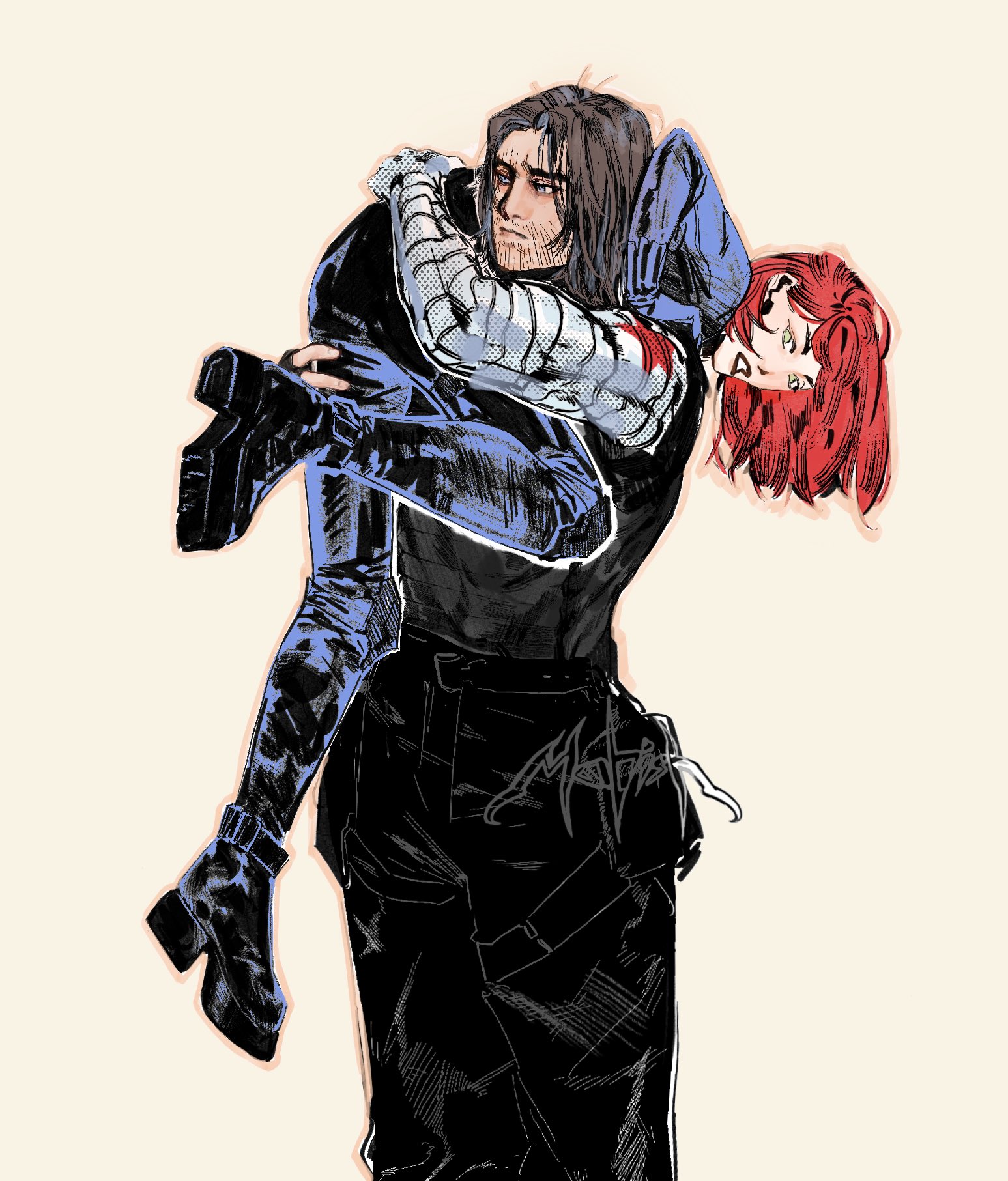 1boy 1girl black_widow brown_hair carrying carrying_over_shoulder carrying_person couple highres marvel mechanical_arms mohishko prosthesis prosthetic_arm red_hair simple_background single_mechanical_arm sketch superhero_costume winter_soldier