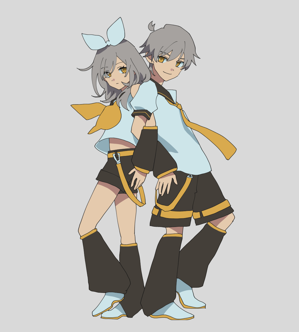 1boy 1girl ahoge back-to-back black_sailor_collar black_shorts black_socks bow bow_hairband caelus_(honkai:_star_rail) closed_mouth cosplay detached_sleeves dual_persona full_body grey_background hairband honkai:_star_rail honkai_(series) kagamine_len kagamine_rin kagamine_rin_(cosplay) medium_hair midriff_peek puffy_short_sleeves puffy_sleeves sailor_collar shoes short_hair short_sleeves shorts simple_background smile socks standing stelle_(honkai:_star_rail) trailblazer_(honkai:_star_rail) udeudede vocaloid white_bow white_footwear yellow_eyes