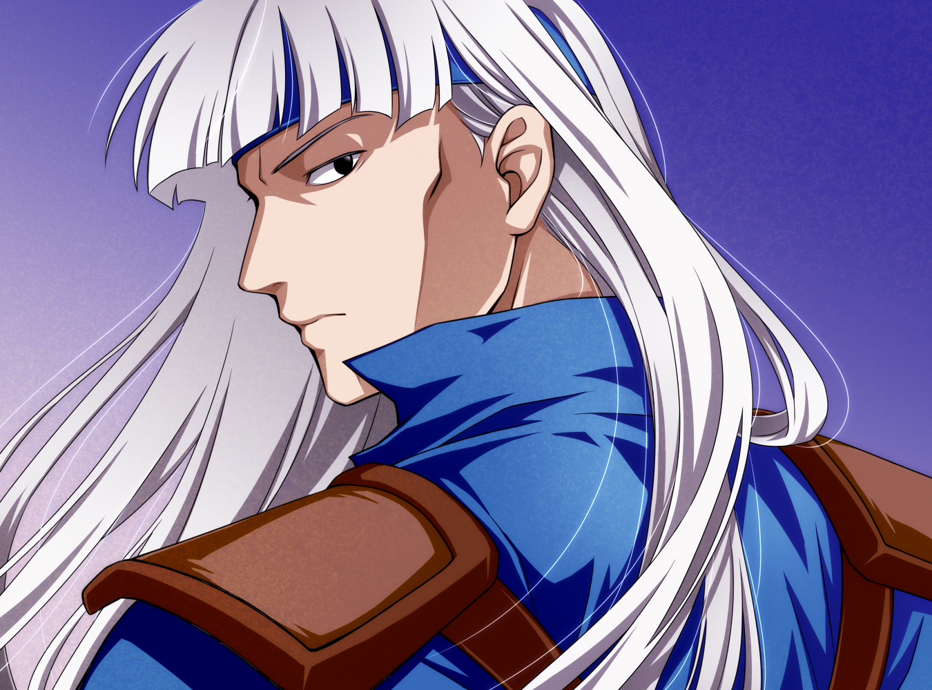 1boy armor black_eyes blue_headband blue_shirt commentary_request fire_emblem fire_emblem:_thracia_776 from_behind ham_pon headband long_hair looking_at_viewer looking_back nintendo pauldrons shirt shoulder_armor simple_background troude_(fire_emblem) white_hair