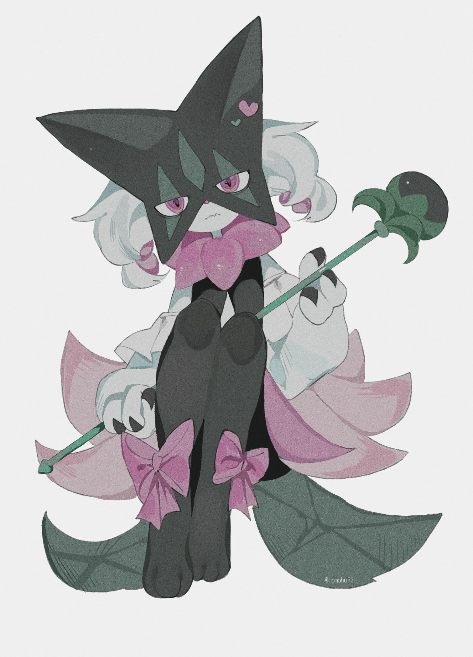 1girl blue_fur closed_mouth expressionless full_body furry highres holding holding_wand leg_ribbon looking_at_viewer meowscarada momohu33 nintendo pink_eyes pink_ribbon pokemon pokemon_(creature) pokemon_focus ribbon solo wand white_background