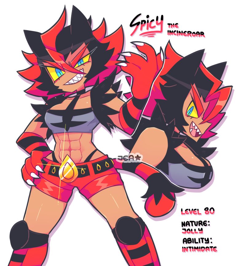 1girl 2018 abs animal_ears arm_at_side arm_up beckoning belt belt_buckle black_choker black_fur black_hair blue_eyes boots breasts buckle cat_ears character_name choker claws cleavage collar collarbone colored_sclera commentary contrapposto crop_top dark-skinned_female dark_skin english_commentary english_text feet_out_of_frame female_focus from_side gameplay_mechanics gen_7_pokemon gold gradient_background grey_shirt grin hand_on_own_hip humanization incineroar jea_(voltaej) looking_at_viewer medium_breasts midriff multicolored_hair multiple_views muscular muscular_arms muscular_female narrow_waist navel nintendo open_mouth original pokemon profile red_footwear red_fur red_hair red_lips red_shorts serious sharp_teeth shirt short_shorts shorts simple_background smile spiked_collar spikes teeth toned toned_female tsurime two-tone_hair v-shaped_eyebrows whale_tail_(clothing) white_background wide_hips yellow_sclera