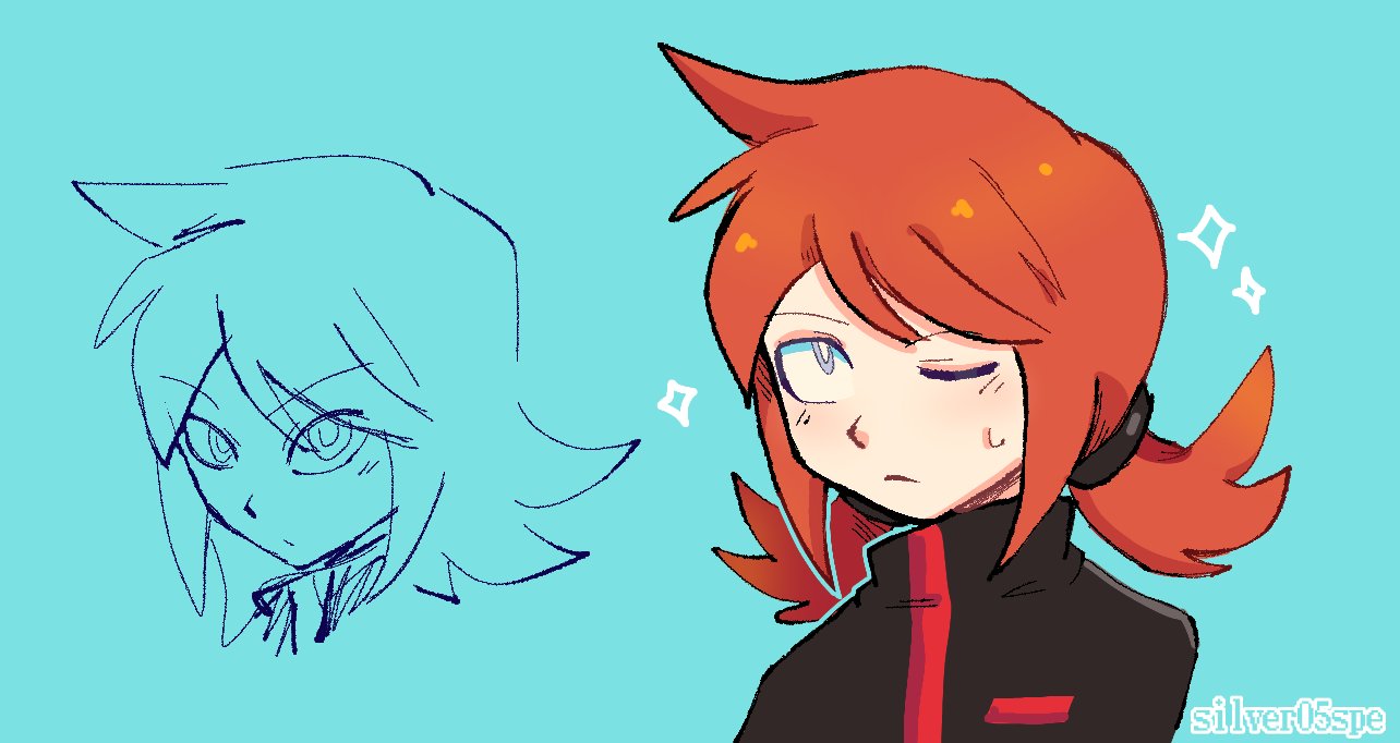 1boy alternate_hairstyle black_hairband black_jacket blue_background grey_eyes hairband jacket long_hair looking_up low_twintails multiple_views nintendo pokemon pokemon_adventures red_hair sidelocks silver05spe silver_(pokemon) solo star_(symbol) sweatdrop twintails upper_body