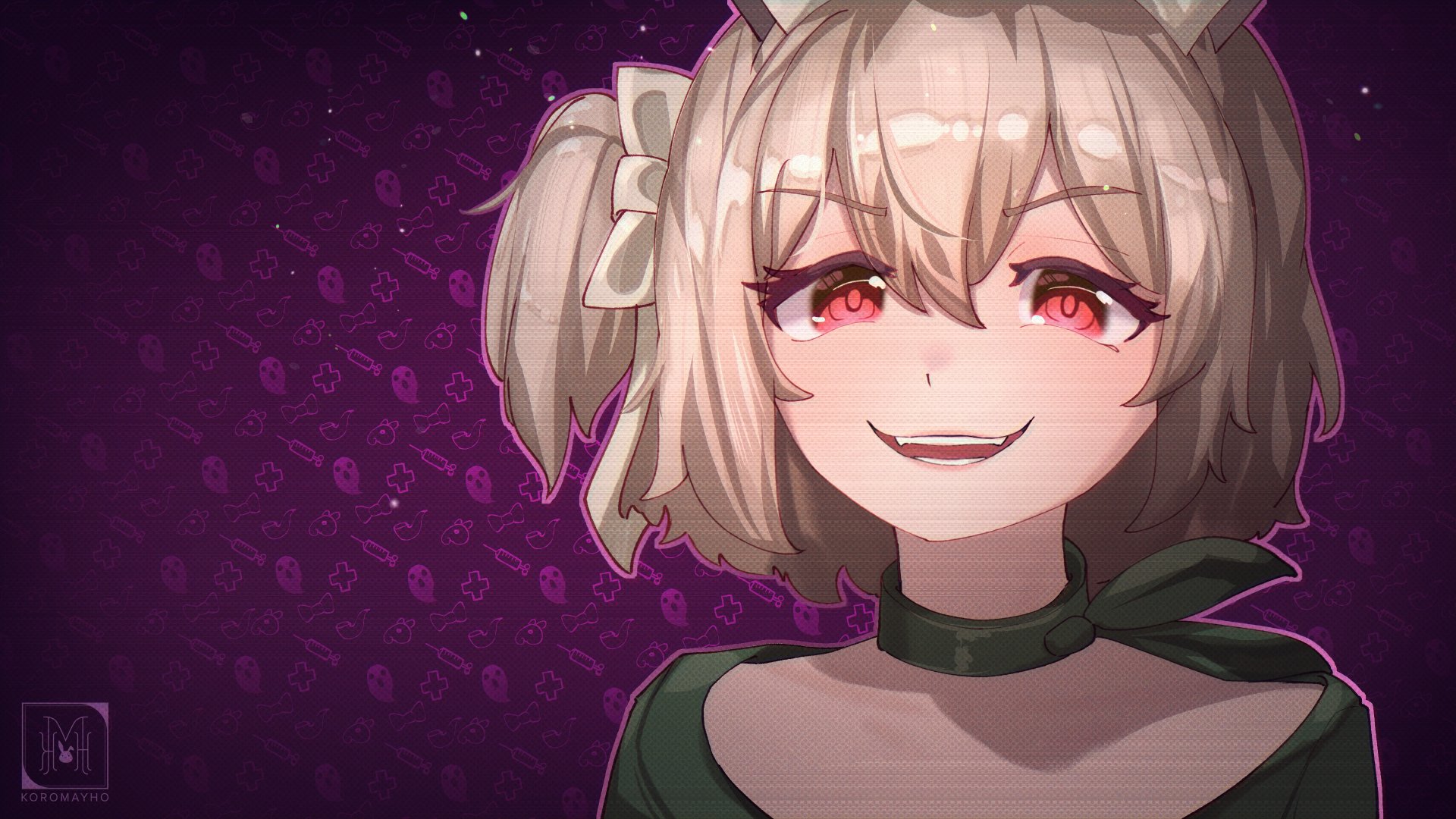 1girl animal_ears brown_hair cosplay evil_smile hat highres indie_virtual_youtuber koromay_ho medium_hair miside mita_(miside)_(cosplay) nimi_nightmare nurse_cap one_side_up open_mouth parody red_eyes smile tapir_girl virtual_youtuber