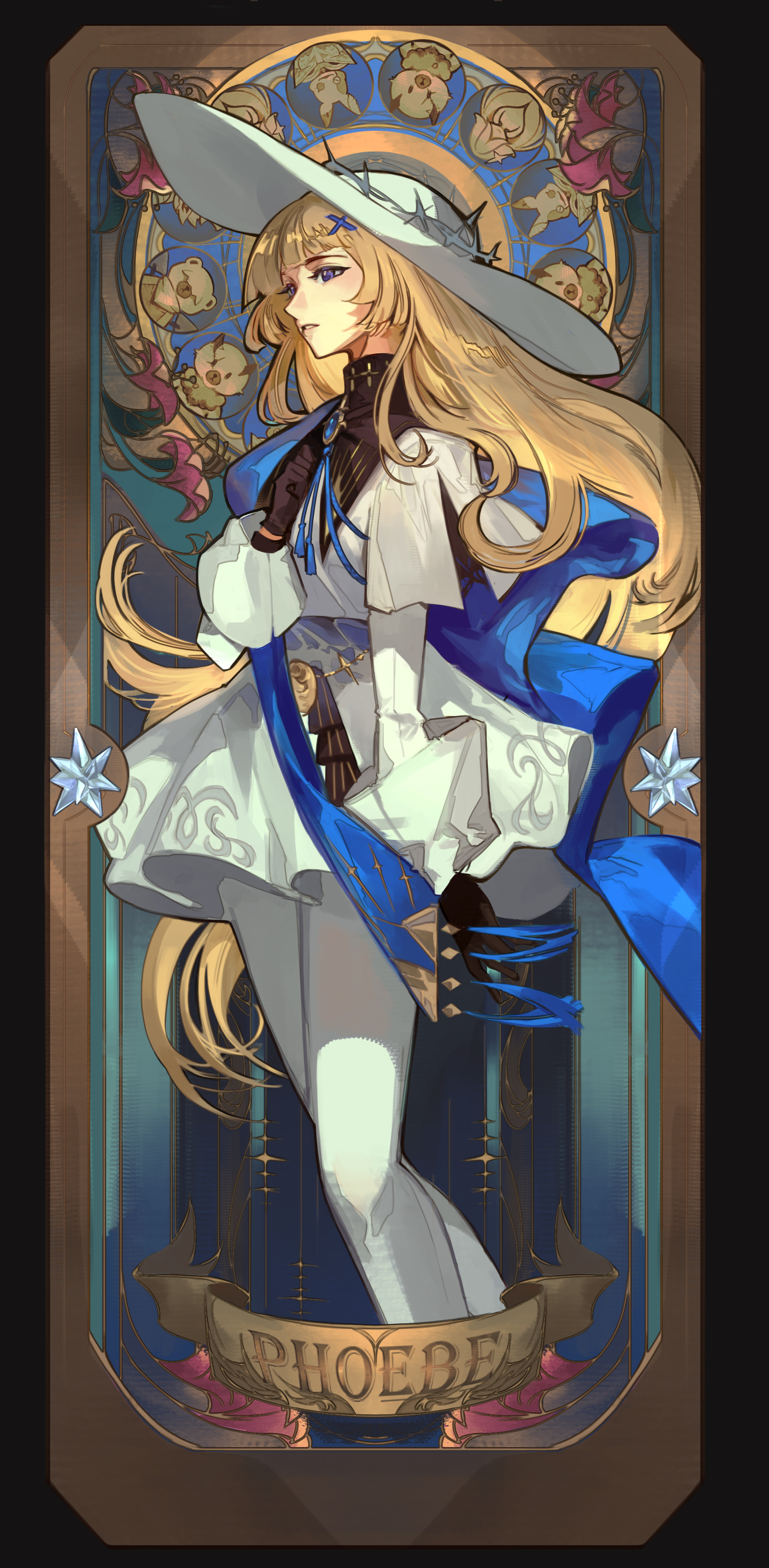 1girl absurdres black_collar black_gloves blonde_hair card_(medium) character_name collar commentary dress gloves hair_ornament hand_up hat highres long_hair long_sleeves looking_ahead pantyhose parted_lips phoebe_(wuthering_waves) purple_eyes solo steve_zheng very_long_hair white_dress white_hat white_pantyhose wuthering_waves x_hair_ornament