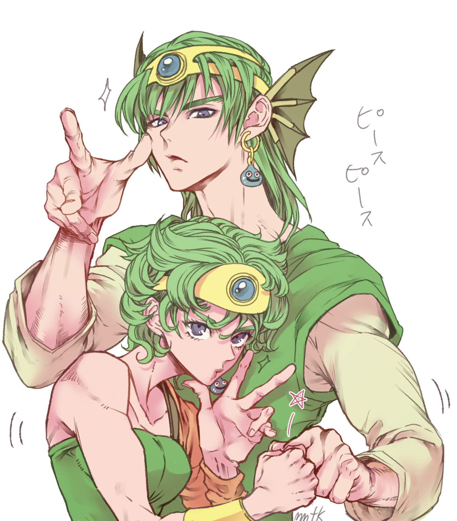 1boy 1girl bare_shoulders blue_eyes blue_gem circlet commentary_request dragon_quest dragon_quest_iv earrings fist_bump gem gold_bracer gold_circlet gold_headdress green_hair green_tube_top green_tunic hero_(dq4) heroine_(dq4) highres jewelry looking_at_viewer matudairaks medium_hair motion_lines short_hair single_bracer single_earring slime_(dragon_quest) sparkle star_(symbol) strapless tube_top tunic upper_body v white_background