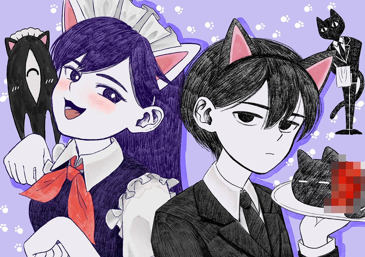 1girl 2boys :3 alternate_costume animal_ears black_eyes black_hair black_necktie blush bright_pupils butler_(omori) cat_ears censored collared_shirt colored_skin fake_animal_ears formal_clothes furry furry_male long_hair long_sleeves looking_at_viewer maid_headdress mari_(headspace)_(omori) mari_(omori) mewo mosaic_censoring msdnno_kabe multiple_boys neckerchief necktie omori omori_(omori) open_mouth purple_eyes purple_hair red_neckerchief shirt short_sleeves smile something_(omori) spoilers suit tongue white_pupils white_shirt white_skin