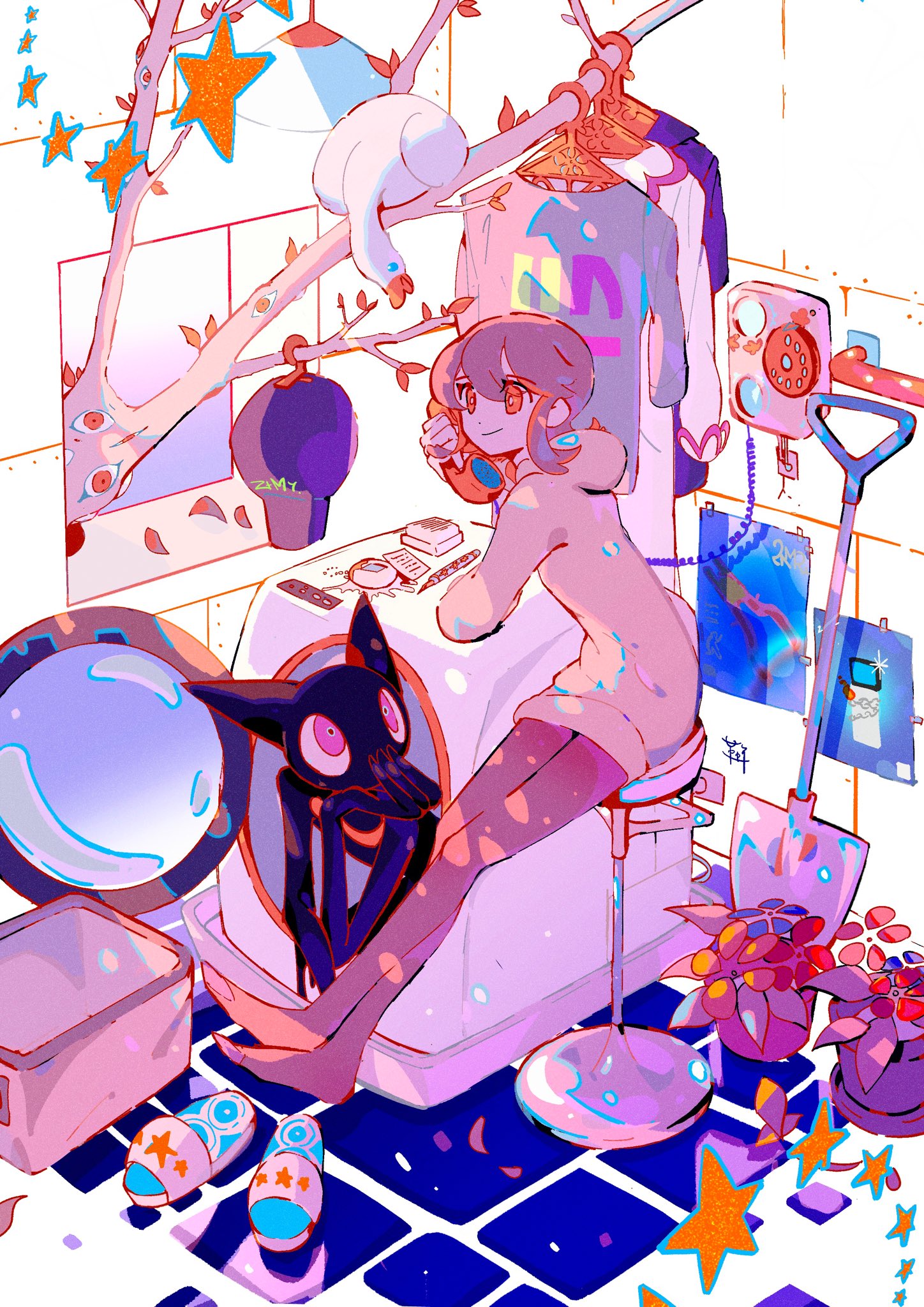 1girl aozukikawasemi black_hat brown_hair cat chair clothes_hanger colored_inner_hair floor grey_hoodie grey_pants hat highres holding holding_phone hood hoodie ink_neko multicolored_hair nira-chan nira-chan_(seigi)_(zutomayo) no_mouth on_chair orange_eyes orange_hair pants phone plant red_eyes seigi_(zutomayo) shirt shovel sitting slippers smile unworn_clothes unworn_hat unworn_headwear unworn_shirt washing_machine white_footwear zutto_mayonaka_de_ii_no_ni