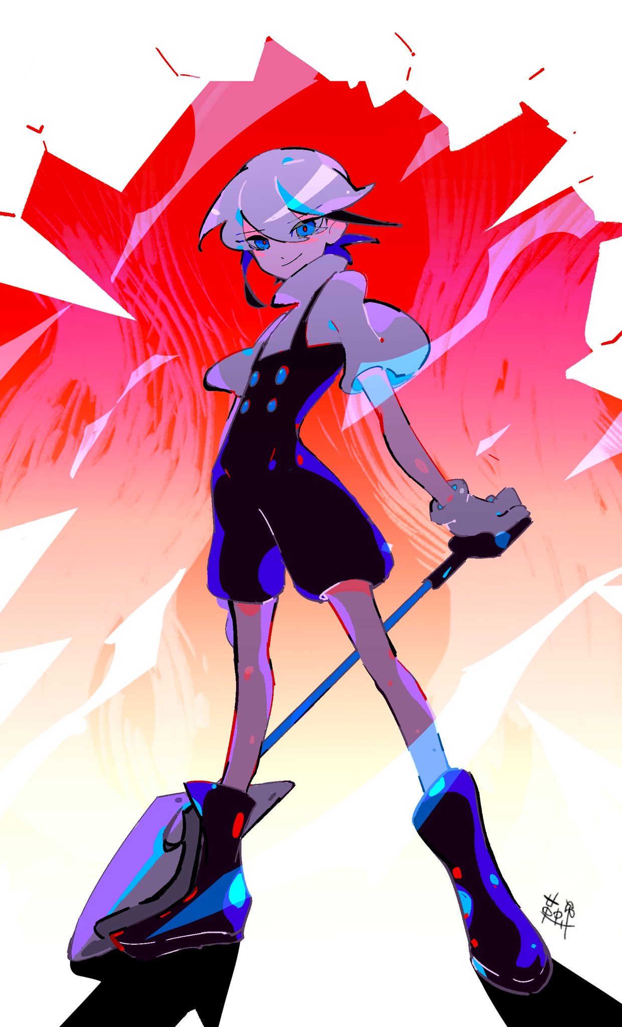 1other ankle_boots aozukikawasemi black_footwear black_hair black_overalls blue_eyes boots colored_inner_hair fastening_(zutomayo) floating_hair highres holding holding_shovel looking_at_viewer multicolored_hair overalls shirt short_sleeves shovel sidelocks smile standing teiketsu_(fastening)_(zutomayo) teiketsu_(zutomayo) turtleneck turtleneck_shirt white_hair white_shirt zutto_mayonaka_de_ii_no_ni