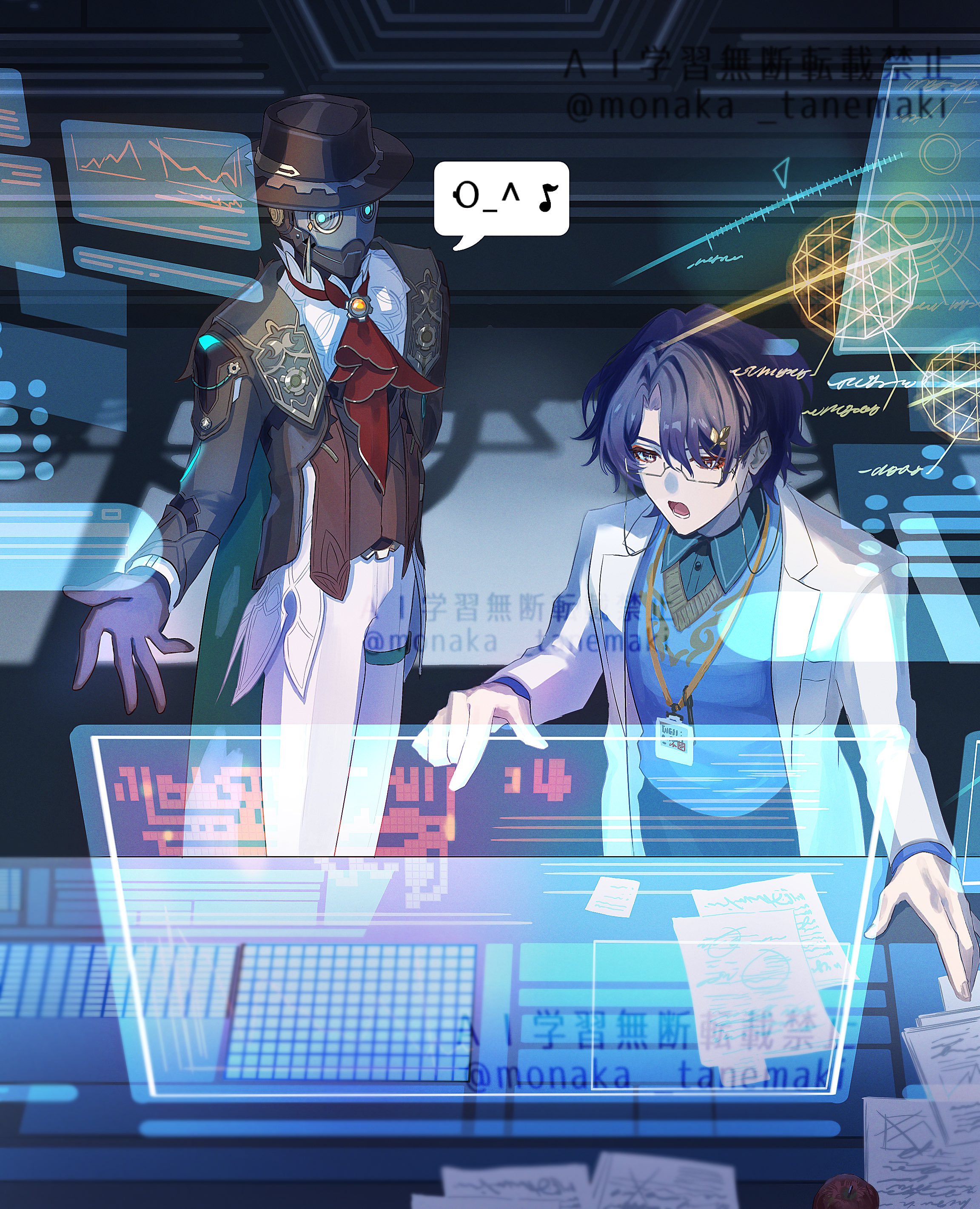 2boys ^_^ absurdres ascot black_gloves black_hat blue_hair blue_vest brown_coat brown_vest closed_eyes coat commentary computer_keyboard dr._ratio_(academia)_(honkai:_star_rail) dr._ratio_(honkai:_star_rail) feet_out_of_frame from_above glasses gloves green_eyes hair_ornament hat highres holographic_interface holographic_monitor honkai:_star_rail honkai_(series) humanoid_robot id_card indoors lab_coat leaf_hair_ornament long_sleeves looking_at_another monocle multiple_boys musical_note open_mouth pants paper pointing red_ascot red_eyes robot screwllum_(honkai:_star_rail) short_hair spoken_musical_note tailcoat tanemaki_monaka thigh_strap twitter_username vest watermark white_coat white_pants