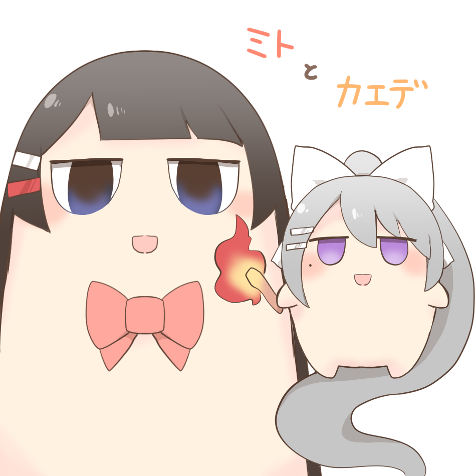 2girls :d blue_eyes blush bow fire grey_hair hair_ornament hair_ribbon hairclip higuchi_kaede holding kaede-chan_(higuchi_kaede) long_hair mito-chan_(tsukino_mito) mito_and_kaede mole mole_under_eye multiple_girls nijisanji open_mouth pink_bow ponytail purple_eyes rebecca_(keinelove) ribbon simple_background smile torch translated tsukino_mito very_long_hair virtual_youtuber white_background white_ribbon