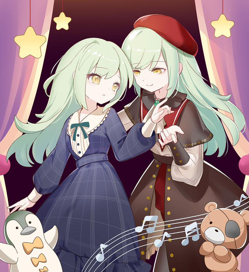 2girls ascot bang_dream! bang_dream!_it's_mygo!!!!! beret black_capelet blue_dress brooch capelet chinese_commentary closed_mouth commentary_request culijiangguocha curtains dress dual_persona eyepatch green_hair hat jewelry long_hair long_sleeves looking_at_another mortis_(bang_dream!) mortis_(costume)_(bang_dream!) mortis_(persona)_(bang_dream!) multiple_girls musical_note red_hat see-through_clothes see-through_sleeves sheet_music shirt standing star_(symbol) stuffed_animal stuffed_penguin stuffed_toy teddy_bear wakaba_mutsumi white_ascot white_shirt yellow_eyes