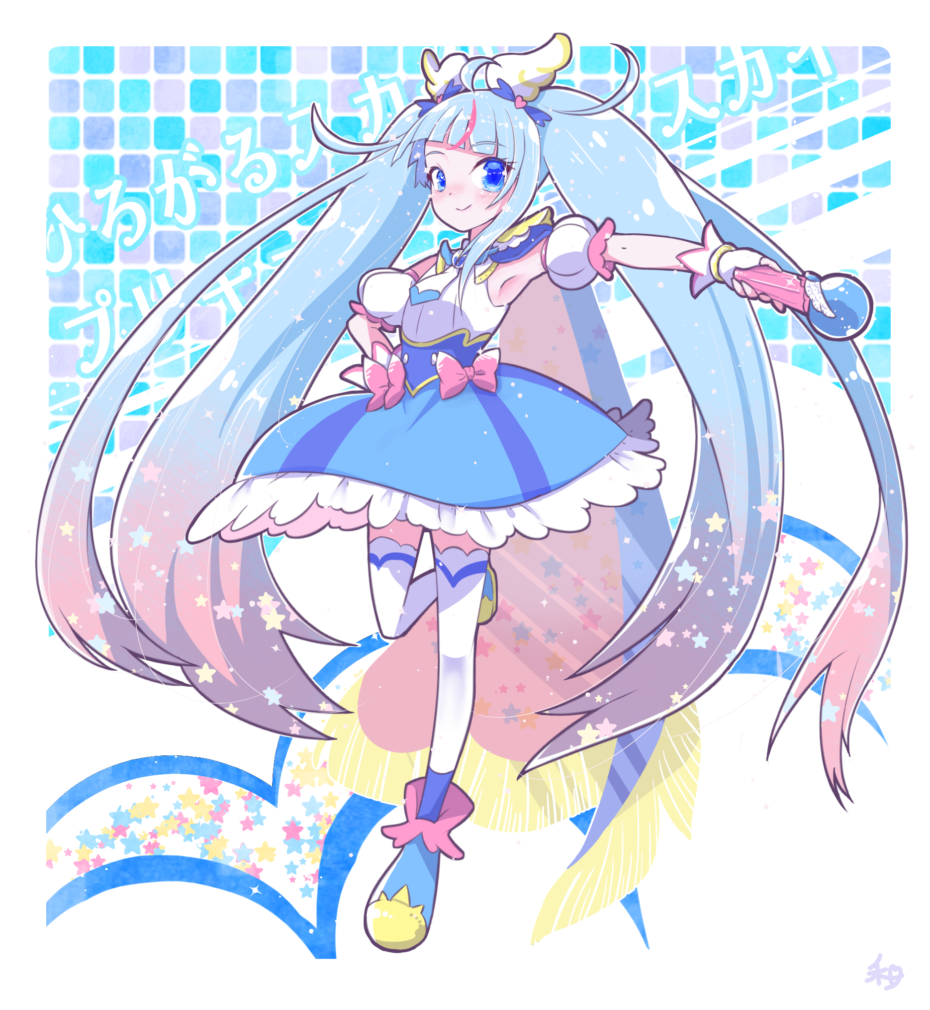 1girl ankle_boots blue_boots blue_cape blue_dress blue_eyes blue_hair boots bow brooch cape closed_mouth commentary_request copyright_name cure_sky cut_bangs detached_sleeves dress dress_bow fingerless_gloves frilled_dress frills fringe_trim full_body gloves gradient_hair hair_ornament hand_on_own_hip highres hirogaru_sky!_precure holding jewelry leg_up long_hair looking_at_viewer magical_girl medium_dress multicolored_hair partial_commentary pink_bow pink_hair precure puffy_detached_sleeves puffy_sleeves red_cape single_sidelock sky_mirage sleeveless sleeveless_dress smile solo sora_harewataru standing standing_on_one_leg streaked_hair takanashi_hiyori text_background thighhighs translated twintails two-sided_cape two-sided_fabric two-tone_dress two-tone_hair very_long_hair white_dress white_gloves white_thighhighs wing_brooch wing_hair_ornament