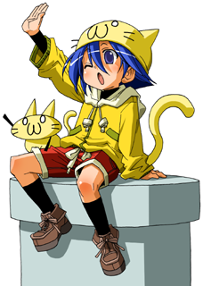 1boy 2channel :3 ;o animal_hat arm_up bad_source black_socks blue_eyes blue_hair brown_shoes cat cat_hat cat_tail character_hat commentary_request creature_and_personification drawstring hair_between_eyes hat hood hooded_jacket iyou_(2ch) jacket kneehighs lowres male_focus maso_(ascii_art) o_o one_eye_closed open_mouth personification red_shorts shoes short_hair shorts simple_background sitting socks solo tail tail_raised white_background yellow_cat yellow_hat yellow_jacket yellow_tail