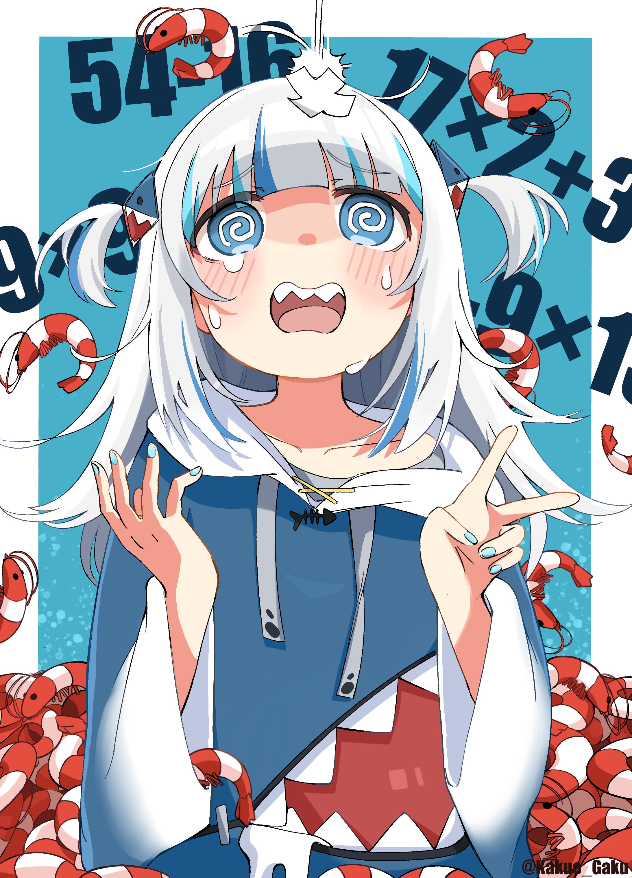1girl @_@ absurdres bandaid bandaid_on_head blue_background blue_eyes blue_hair blue_hoodie blue_nails blunt_bangs blush border collarbone commentary crying drawstring gawr_gura hair_ornament highres hololive hololive_english hood hood_down hoodie kakue_gaku long_hair long_sleeves math multicolored_hair nail_polish open_mouth outside_border shark_hair_ornament sharp_teeth shrimp simple_background solo streaked_hair untranslatable_commentary tears teeth twitter_username two_side_up upper_body v virtual_youtuber white_border white_hair wide_sleeves