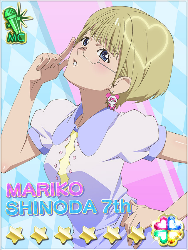 1girl adjusting_eyewear akb0048 blue_eyes blue_shirt card_(medium) character_name ear_piercing glasses green_hair hand_on_own_hip heart index_finger_raised katagiri_tsubasa non-web_source official_art parted_lips piercing shirt short_hair short_sleeves solo standing star_(symbol) two-tone_background upper_body