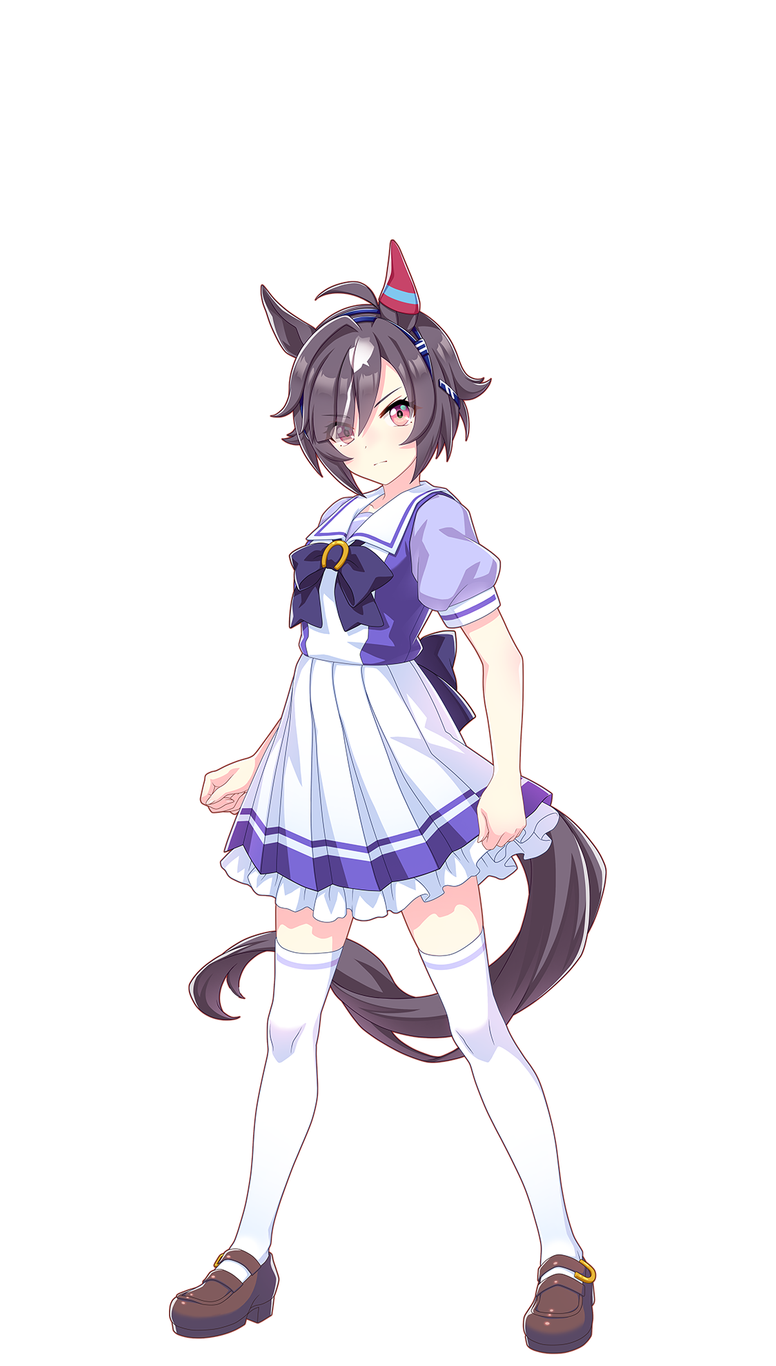 1girl ahoge animal_ears believe_(umamusume) black_hair bow bowtie breasts brown_shoes clenched_hands closed_mouth ear_covers frilled_skirt frills full_body hair_between_eyes hair_ornament hair_over_one_eye hairpin highres horse_ears horse_girl horse_tail horseshoe_ornament loafers looking_at_viewer miniskirt multicolored_hair official_art pleated_skirt puffy_short_sleeves puffy_sleeves purple_ribbon purple_shirt raglan_sleeves red_eyes ribbon sailor_collar sailor_shirt school_uniform shirt shoes short_hair short_sleeves single_ear_cover skirt small_breasts solo standing streaked_hair summer_uniform tail thighhighs tracen_school_uniform transparent_background two-tone_hair umamusume white_hair white_sailor_collar white_skirt white_thighhighs zettai_ryouiki