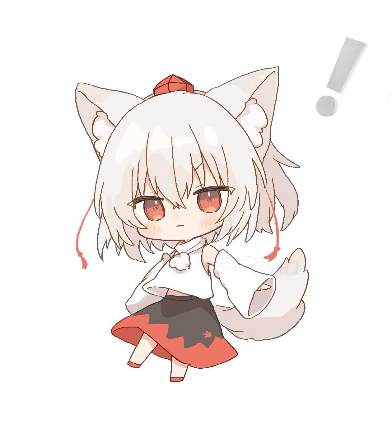 ! 1girl animal_ear_fluff animal_ears bare_shoulders black_skirt blush chaki_(kinaneko2149) chibi chibi_only closed_mouth commentary_request detached_sleeves full_body hat highres inubashiri_momiji looking_at_viewer pom_pom_(clothes) red_eyes red_footwear red_hat red_skirt shirt short_hair simple_background skirt sleeveless sleeveless_shirt solo tail tokin_hat touhou turtleneck turtleneck_shirt two-tone_skirt white_background white_hair white_shirt white_sleeves wide_sleeves wolf_ears wolf_girl wolf_tail