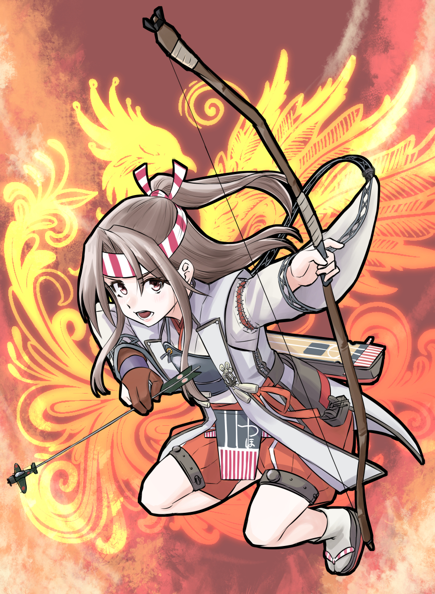 1girl apron arrow_(projectile) bow_(weapon) brown_eyes brown_hair commission gloves hachimaki hakama hakama_shorts headband high_ponytail highres holding holding_arrow japanese_clothes jinbaori kantai_collection long_hair muneate nekotarou_(nktr299) open_mouth partially_fingerless_gloves partly_fingerless_gloves pixiv_commission ponytail red_hakama red_shorts rigging shorts solo striped_headband weapon wide_sleeves yugake zuihou_(kancolle)
