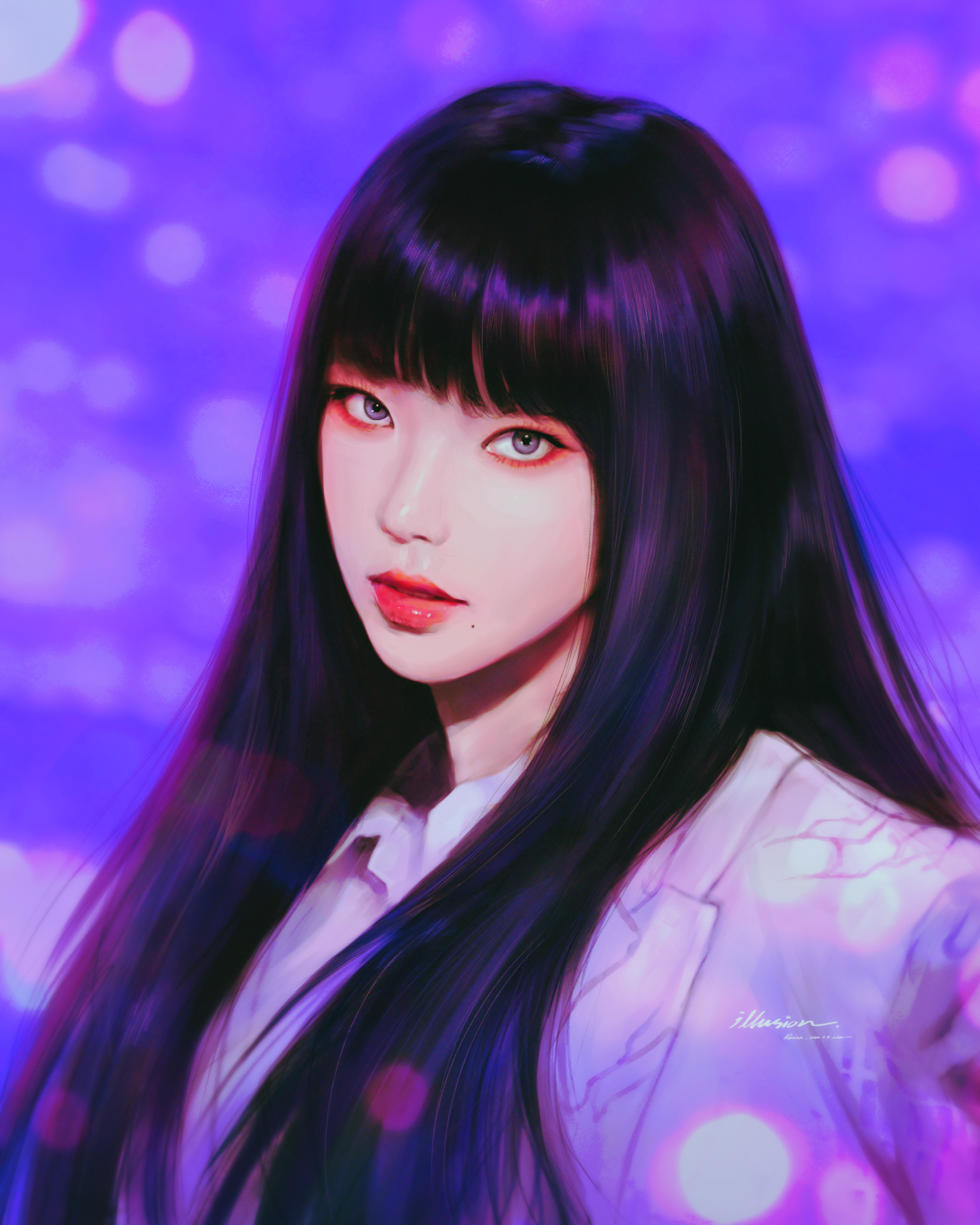 1girl aespa blunt_bangs closed_mouth eyeshadow hashtag-only_commentary highres jacket k-pop karina_(aespa) long_hair looking_at_viewer makeup mole parted_lips purple_background real_life realistic red_eyeshadow signature sin_daybreak solo upper_body white_jacket