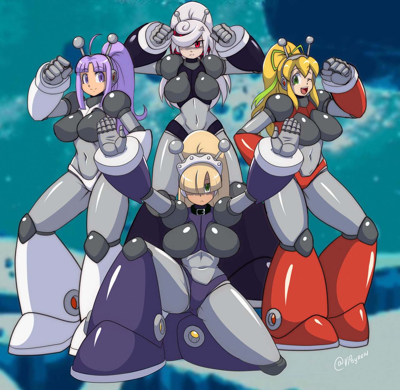 antenna_hair antennae armor armored_boots armored_gloves arms_up bikini_armor black_armor blonde_hair blue_eyes blush boots breasts character_request clenched_hand crossover embarrassed green_ribbon grey_hair hair_over_one_eye hair_ribbon hairband headphones highres hyper_roll_(marvel_vs._capcom) joints knee_boots large_breasts long_hair looking_at_viewer maid_headdress marvel_vs._capcom mechanical_arms mechanical_boots mechanical_legs mega_man_(classic) mega_man_(series) multicolored_hair multiple_crossover open_mouth piano_(megaman_megamix) ponytail purple_armor purple_eyes purple_hair radio_antenna raised_fist red_armor red_eyes red_hair ribbon robot robot_girl robot_joints roll_(mega_man) sage_(sonic) shoulder_armor sidelocks smile sonic_(series) sonic_frontiers two-tone_hair white_armor white_hair