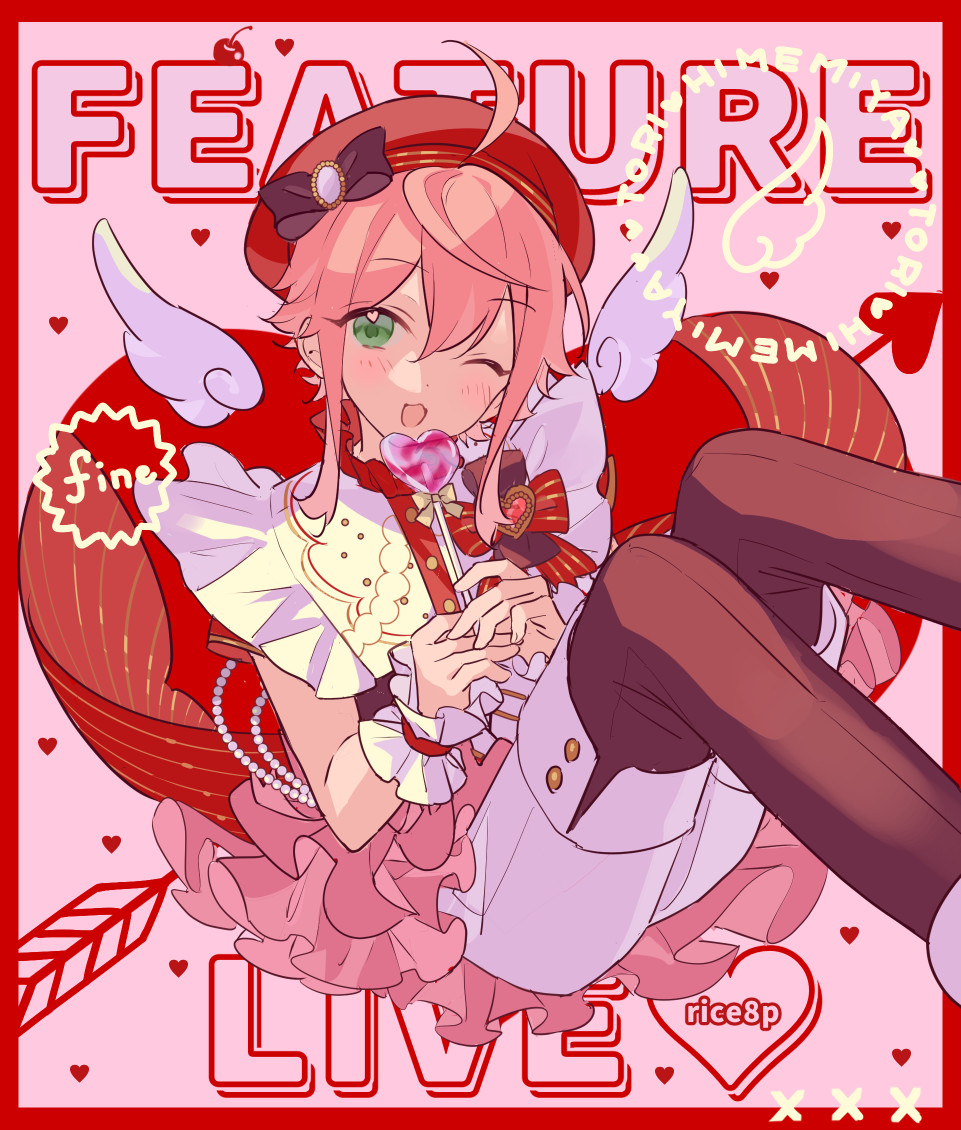 1boy ahoge angel_wings arrow_(symbol) beret border ensemble_stars! feet_out_of_frame frilled_skirt frilled_sleeves frills green_eyes hair_between_eyes hat himemiya_tori leaning_back looking_at_viewer male_focus medium_hair official_alternate_costume one_eye_closed open_mouth pink_hair red_border red_hat rice_(rice8p) short_sleeves shorts skirt solo white_shorts wings
