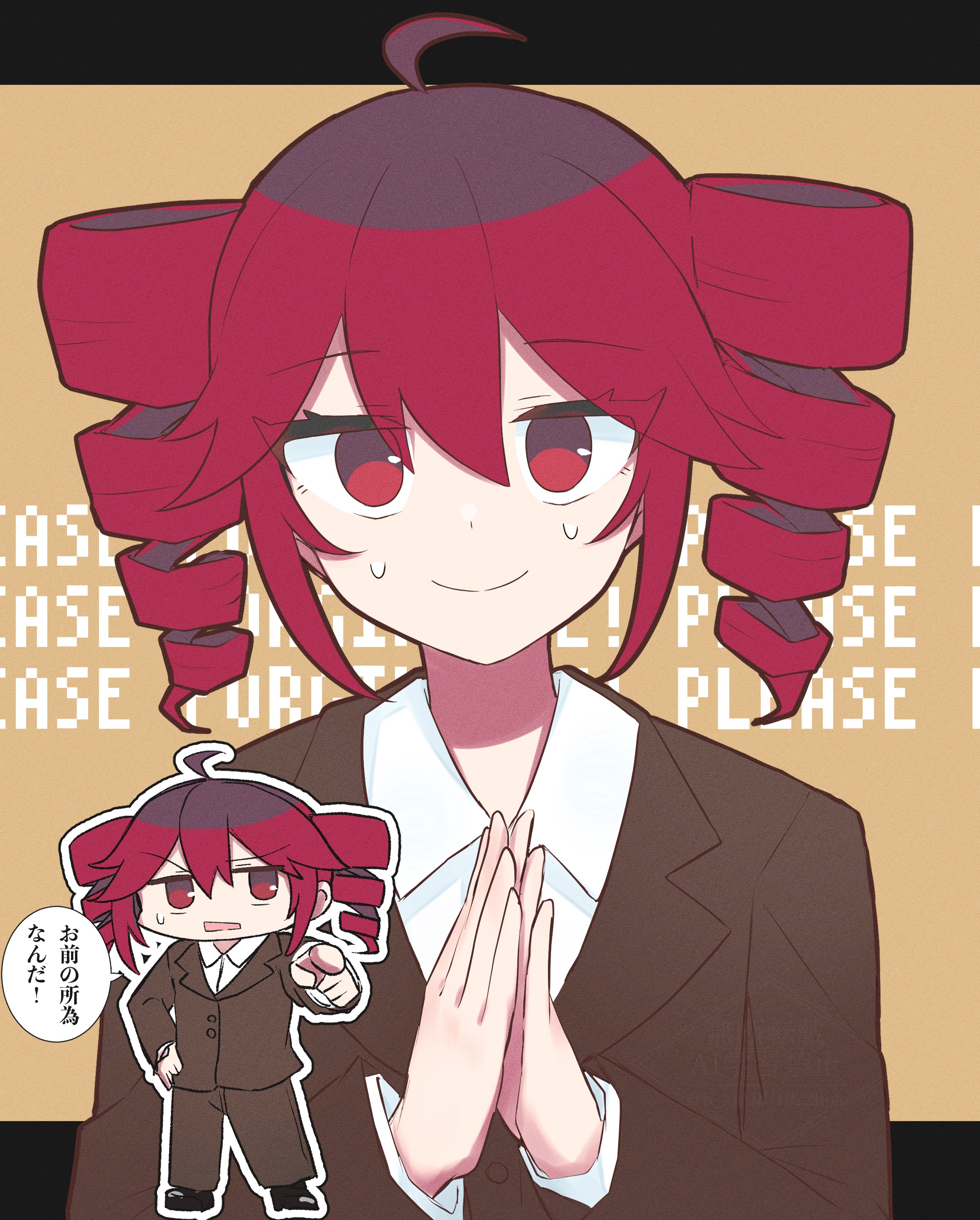 1girl absurdres ahoge brown_pants brown_suit chibi collared_shirt drill_hair formal_clothes hair_between_eyes hand_on_own_hip highres kasane_teto keemaru_(k_maru1022holo) nervous_smile own_hands_together pants pointing red_eyes red_hair shirt smile speech_bubble suit sweatdrop taihaiteki_jinsei_sanka_(utau) twin_drills upper_body utau white_shirt